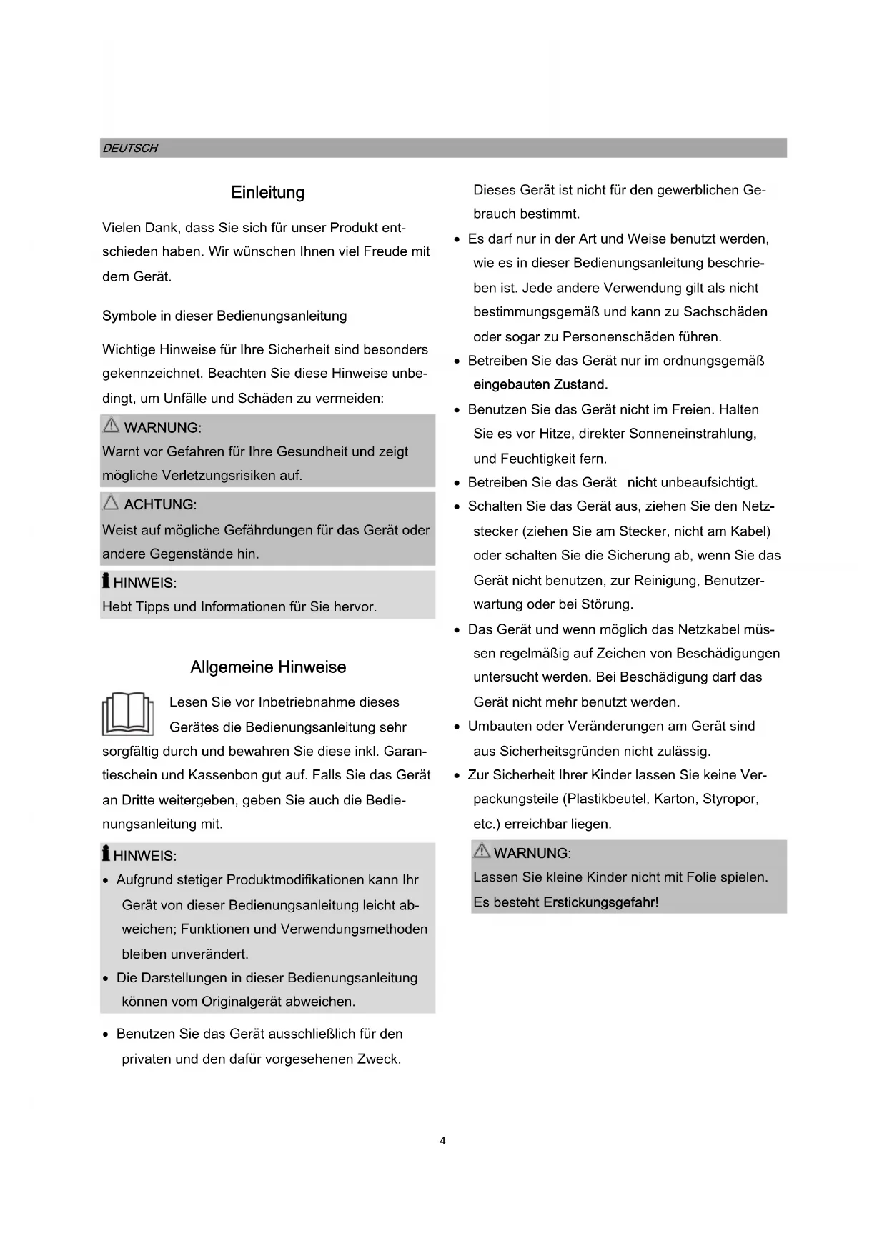 HINWEIS: Aufgrund stetiger Produktmodifikationen kann Ihr Gerät von dieser Bedienungsanleitung leicht ab- weichen; Funktionen und Verwendungsmethoden bleiben unverändert. Die Darstellungen in dieser Bedienungsanleitung können vom Originalgerät abweichen. Benutzen Sie das Gerät ausschließlich für den privaten und den dafür vorgesehenen Zweck. Dieses Gerät ist nicht für den gewerblichen Ge- brauch bestimmt. Es darf nur in der Art und Weise benutzt werden, wie es in dieser Bedienungsanleitung beschrie- ben ist. Jede andere Verwendung gilt als nicht bestimmungsgemäß und kann zu Sachschäden oder sogar zu Personenschäden führen. Betreiben Sie das Gerät nur im ordnungsgemäß eingebauten Zustand. Benutzen Sie das Gerät nicht im Freien. Halten Sie es vor Hitze, direkter Sonneneinstrahlung, und Feuchtigkeit fern. Betreiben Sie das Gerät nicht unbeaufsichtigt. Schalten Sie das Gerät aus, ziehen Sie den Netz- stecker (ziehen Sie am Stecker, nicht am Kabel) oder schalten Sie die Sicherung ab, wenn Sie das Gerät nicht benutzen, zur Reinigung, Benutzer- wartung oder bei Störung. Das Gerät und wenn möglich das Netzkabel müs- sen regelmäßig auf Zeichen von Beschädigungen untersucht werden. Bei Beschädigung darf das Gerät nicht mehr benutzt werden. Umbauten oder Veränderungen am Gerät sind aus Sicherheitsgründen nicht zulässig. Zur Sicherheit Ihrer Kinder lassen Sie keine Ver- packungsteile (Plastikbeutel, Karton, Styropor, etc.) erreichbar liegen. WARNUNG: Lassen Sie kleine Kinder nicht mit Folie spielen. Es besteht Erstickungsgefahr!5