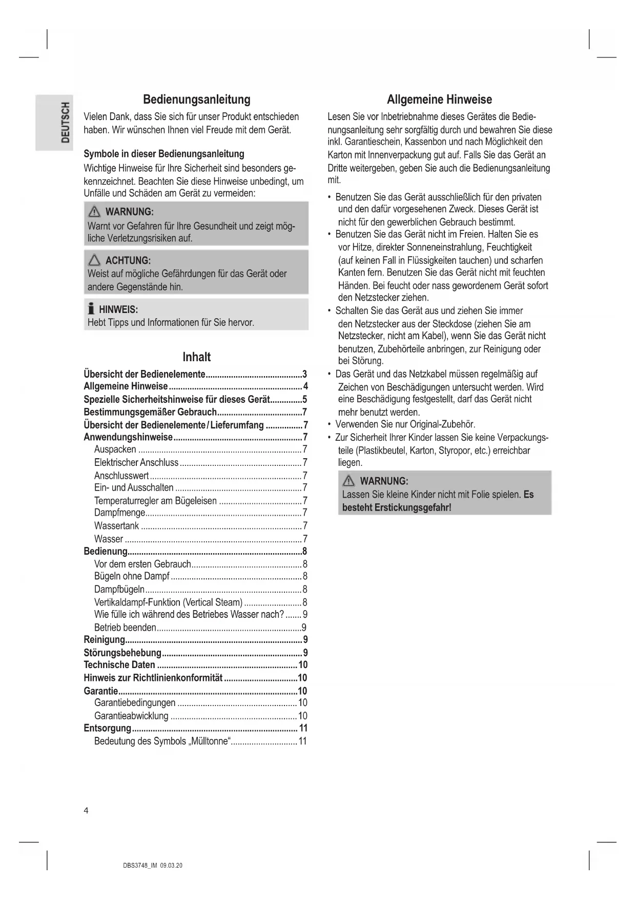 - Zur Sicherheit Ihrer Kinder lassen Sie keine Verpackungs- teile (Plastikbeutel, Karton, Styropor, etc.) erreichbar liegen. WARNUNG: Lassen Sie kleine Kinder nicht mit Folie spielen. Es besteht Erstickungsgefahr!5 DBS3748_IM 09.03.20 Spezielle Sicherheitshinweise für dieses Gerät Auf dem Produkt nden Sie folgendes Symbol mit Warncharakter: WARNUNG: Heiße Oberäche! Verbrennungsgefahr! Während des Betriebs und danach kann die Temperatur der be- rührbaren Oberächen sehr hoch sein. WARNUNG: