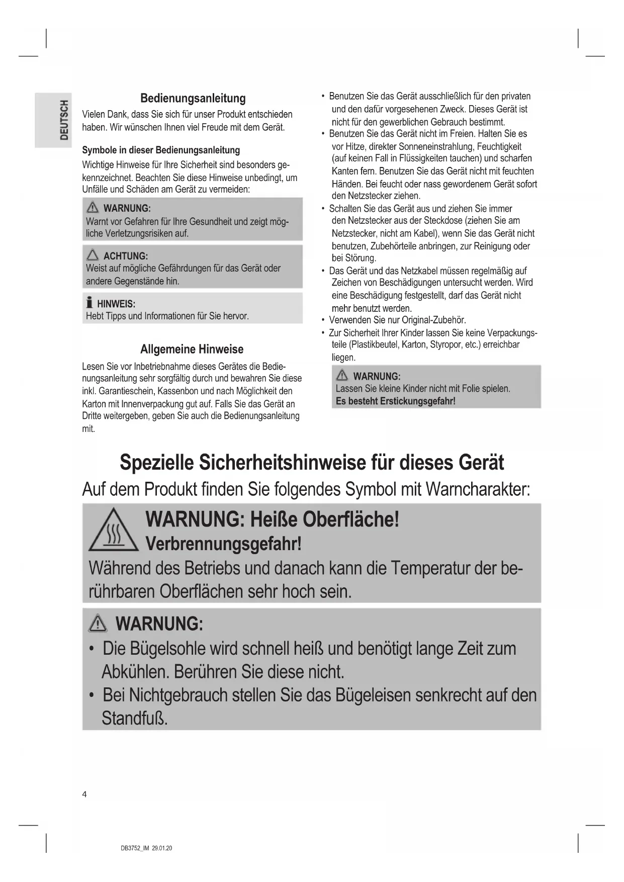 - Bei Nichtgebrauch stellen Sie das Bügeleisen senkrecht auf den Standfuß.5 DB3752_IM 29.01.20 WARNUNG: