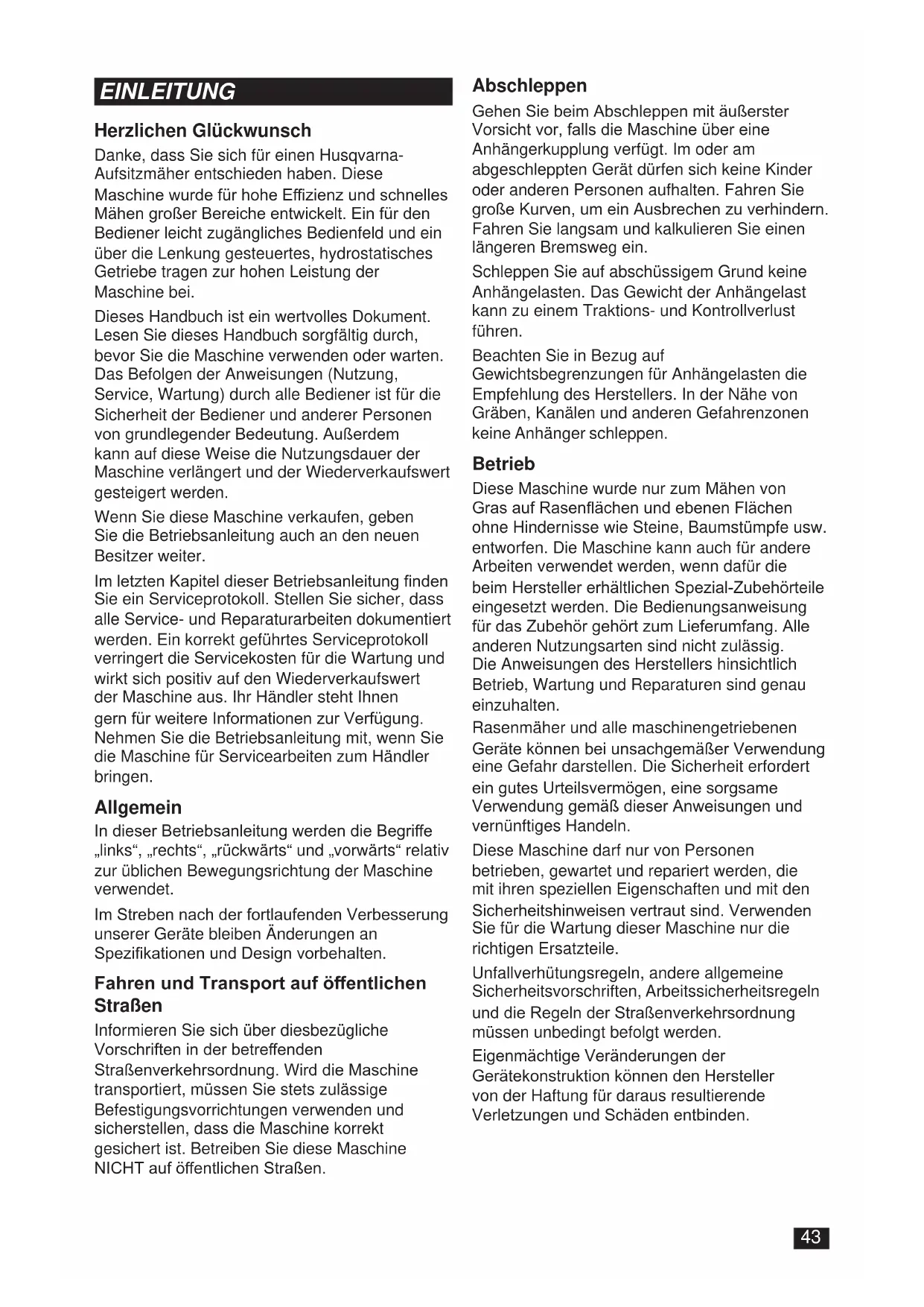 INHALTHerzlichen Glückwunsch Danke, dass Sie sich für einen Husqvarna- Aufsitzmäher entschieden haben. Diese Maschine wurde für hohe Ezienz und schnelles Mähen großer Bereiche entwickelt. Ein für den Bediener leicht zugängliches Bedienfeld und ein über die Lenkung gesteuertes, hydrostatisches Getriebe tragen zur hohen Leistung der Maschine bei. Dieses Handbuch ist ein wertvolles Dokument. Lesen Sie dieses Handbuch sorgfältig durch, bevor Sie die Maschine verwenden oder warten. Das Befolgen der Anweisungen (Nutzung, Service, Wartung) durch alle Bediener ist für die Sicherheit der Bediener und anderer Personen von grundlegender Bedeutung. Außerdem kann auf diese Weise die Nutzungsdauer der Maschine verlängert und der Wiederverkaufswert gesteigert werden. Wenn Sie diese Maschine verkaufen, geben Sie die Betriebsanleitung auch an den neuen Besitzer weiter. Im letzten Kapitel dieser Betriebsanleitung nden Sie ein Serviceprotokoll. Stellen Sie sicher, dass alle Service- und Reparaturarbeiten dokumentiert werden. Ein korrekt geführtes Serviceprotokoll verringert die Servicekosten für die Wartung und wirkt sich positiv auf den Wiederverkaufswert der Maschine aus. Ihr Händler steht Ihnen gern für weitere Informationen zur Verfügung. Nehmen Sie die Betriebsanleitung mit, wenn Sie die Maschine für Servicearbeiten zum Händler bringen. Allgemein In dieser Betriebsanleitung werden die Begrie „links“, „rechts“, „rückwärts“ und „vorwärts“ relativ zur üblichen Bewegungsrichtung der Maschine verwendet. Im Streben nach der fortlaufenden Verbesserung unserer Geräte bleiben Änderungen an Spezikationen und Design vorbehalten. Fahren und Transport auf öentlichen Straßen Informieren Sie sich über diesbezügliche Vorschriften in der betreenden Straßenverkehrsordnung. Wird die Maschine transportiert, müssen Sie stets zulässige Befestigungsvorrichtungen verwenden und sicherstellen, dass die Maschine korrekt gesichert ist. Betreiben Sie diese Maschine NICHT auf öentlichen Straßen. Abschleppen Gehen Sie beim Abschleppen mit äußerster Vorsicht vor, falls die Maschine über eine Anhängerkupplung verfügt. Im oder am abgeschleppten Gerät dürfen sich keine Kinder oder anderen Personen aufhalten. Fahren Sie große Kurven, um ein Ausbrechen zu verhindern. Fahren Sie langsam und kalkulieren Sie einen längeren Bremsweg ein. Schleppen Sie auf abschüssigem Grund keine Anhängelasten. Das Gewicht der Anhängelast kann zu einem Traktions- und Kontrollverlust führen. Beachten Sie in Bezug auf Gewichtsbegrenzungen für Anhängelasten die Empfehlung des Herstellers. In der Nähe von Gräben, Kanälen und anderen Gefahrenzonen keine Anhänger schleppen. Betrieb Diese Maschine wurde nur zum Mähen von Gras auf Rasenächen und ebenen Flächen ohne Hindernisse wie Steine, Baumstümpfe usw. entworfen. Die Maschine kann auch für andere Arbeiten verwendet werden, wenn dafür die beim Hersteller erhältlichen Spezial-Zubehörteile eingesetzt werden. Die Bedienungsanweisung für das Zubehör gehört zum Lieferumfang. Alle anderen Nutzungsarten sind nicht zulässig. Die Anweisungen des Herstellers hinsichtlich Betrieb, Wartung und Reparaturen sind genau einzuhalten. Rasenmäher und alle maschinengetriebenen Geräte können bei unsachgemäßer Verwendung eine Gefahr darstellen. Die Sicherheit erfordert ein gutes Urteilsvermögen, eine sorgsame Verwendung gemäß dieser Anweisungen und vernünftiges Handeln. Diese Maschine darf nur von Personen betrieben, gewartet und repariert werden, die mit ihren speziellen Eigenschaften und mit den Sicherheitshinweisen vertraut sind. Verwenden Sie für die Wartung dieser Maschine nur die richtigen Ersatzteile. Unfallverhütungsregeln, andere allgemeine Sicherheitsvorschriften, Arbeitssicherheitsregeln und die Regeln der Straßenverkehrsordnung müssen unbedingt befolgt werden. Eigenmächtige Veränderungen der Gerätekonstruktion können den Hersteller von der Haftung für daraus resultierende Verletzungen und Schäden entbinden.