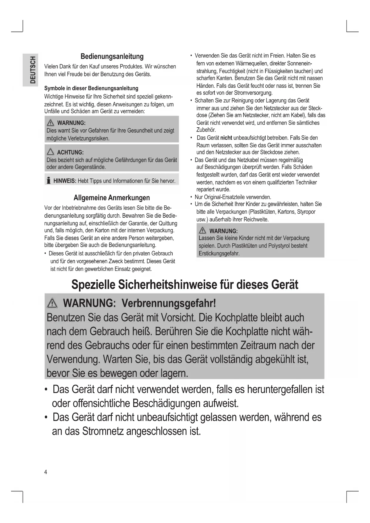- Um die Sicherheit Ihrer Kinder zu gewährleisten, halten Sie bitte alle Verpackungen (Plastiktüten, Kartons, Styropor usw.) außerhalb ihrer Reichweite. WARNUNG: Lassen Sie kleine Kinder nicht mit der Verpackung spielen. Durch Plastiktüten und Polystyrol besteht Erstickungsgefahr. Spezielle Sicherheitshinweise für dieses Gerät WARNUNG: Verbrennungsgefahr! Benutzen Sie das Gerät mit Vorsicht. Die Kochplatte bleibt auch nach dem Gebrauch heiß. Berühren Sie die Kochplatte nicht wäh- rend des Gebrauchs oder für einen bestimmten Zeitraum nach der Verwendung. Warten Sie, bis das Gerät vollständig abgekühlt ist, bevor Sie es bewegen oder lagern.