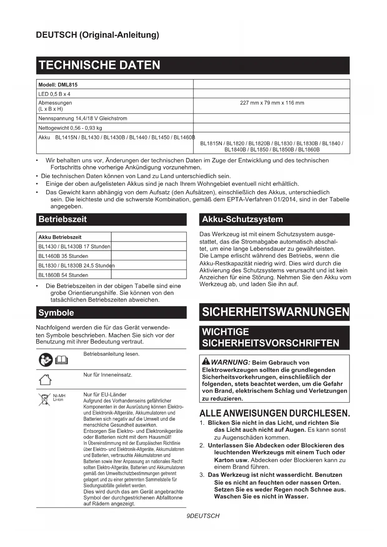 - DieBetriebszeiteninderobigenTabellesindeine grobeOrientierungshilfe.Siekönnenvonden tatsächlichenBetriebszeitenabweichen. Symbole NachfolgendwerdendiefürdasGerätverwende- tenSymbolebeschrieben.MachenSiesichvorder Benutzung mit ihrer Bedeutung vertraut. Betriebsanleitunglesen.NurfürInneneinsatz. Ni-MH Li-ionNurfürEU-LänderAufgrunddesVorhandenseinsgefährlicherKomponenteninderAusrüstungkönnenElektro-undElektronik-Altgeräte,AkkumulatorenundBatterien sich negativ auf die Umwelt und die menschliche Gesundheit auswirken.EntsorgenSieElektro-undElektronikgeräteoderBatteriennichtmitdemHausmüll!InÜbereinstimmungmitderEuropäischenRichtlinieüberElektro-undElektronik-Altgeräte,AkkumulatorenundBatterien,verbrauchteAkkumulatorenundBatteriensowieihrerAnpassungannationalesRechtsolltenElektro-Altgeräte,BatterienundAkkumulatorengemäßdenUmweltschutzbestimmungengetrenntgelagertundzueinergetrenntenSammelstellefürSiedlungsabfällegeliefertwerden.DieswirddurchdasamGerätangebrachteSymbolderdurchgestrichenenAbfalltonneaufRädernangezeigt. Akku-Schutzsystem Das Werkzeug ist mit einem Schutzsystem ausge- stattet,dasdieStromabgabeautomatischabschal- tet,umeinelangeLebensdauerzugewährleisten. DieLampeerlischtwährenddesBetriebs,wenndie Akku-Restkapazitätniedrigwird.Dieswirddurchdie AktivierungdesSchutzsystemsverursachtundistkein AnzeichenfüreineStörung.NehmenSiedenAkkuvom Werkzeugab,undladenSieihnauf. SICHERHEITSWARNUNGEN WICHTIGE SICHERHEITSVORSCHRIFTEN WARNUNG: Beim Gebrauch von Elektrowerkzeugen sollten die grundlegenden Sicherheitsvorkehrungen, einschließlich der folgenden, stets beachtet werden, um die Gefahr von Brand, elektrischem Schlag und Verletzungen zu reduzieren. ALLE ANWEISUNGEN DURCHLESEN.