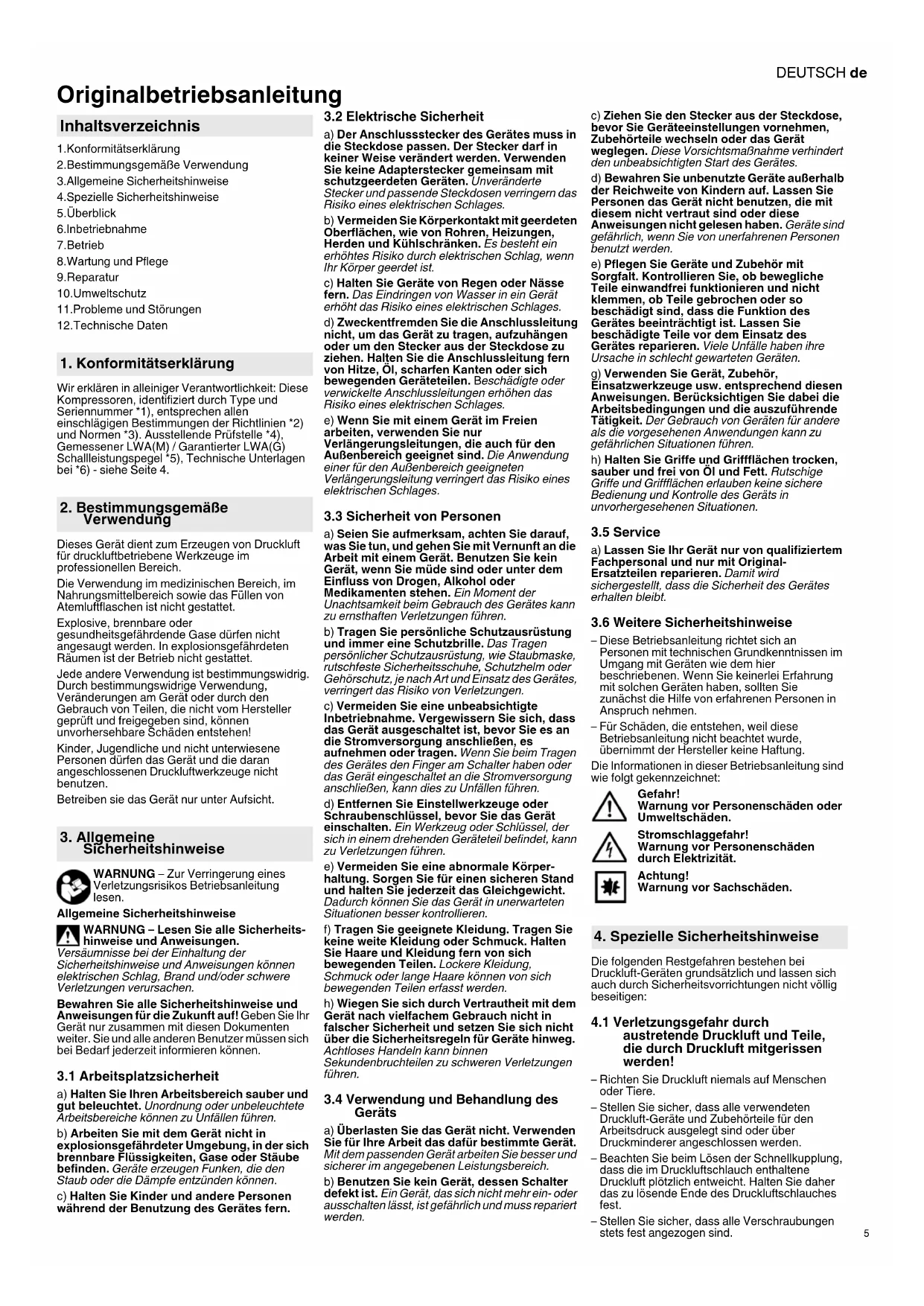 Originalbetriebsanleitung 1.Konformitätserklärung 2.Bestimmungsgemäße Verwendung 3.Allgemeine Sicherheitshinweise 4.Spezielle Sicherheitshinweise 5.Überblick 6.Inbetriebnahme 7.Betrieb 8.Wartung und Pflege 9.Reparatur 10.Umweltschutz 11.Probleme und Störungen 12.Technische Daten Wir erklären in alleiniger Verantwortlichkeit: Diese Kompressoren, identifiziert durch Type und Seriennummer *1), entsprechen allen einschlägigen Bestimmungen der Richtlinien *2) und Normen *3). Ausstellende Prüfstelle *4), Gemessener LWA(M) / Garantierter LWA(G) Schallleistungspegel *5), Technische Unterlagen bei *6) - siehe Seite 4. Dieses Gerät dient zum Erzeugen von Druckluft für druckluftbetriebene Werkzeuge im professionellen Bereich. Die Verwendung im medizinischen Bereich, im Nahrungsmittelbereich sowie das Füllen von Atemluftflaschen ist nicht gestattet. Explosive, brennbare oder gesundheitsgefährdende Gase dürfen nicht angesaugt werden. In explosionsgefährdeten Räumen ist der Betrieb nicht gestattet. Jede andere Verwendung ist bestimmungswidrig. Durch bestimmungswidrige Verwendung, Veränderungen am Gerät oder durch den Gebrauch von Teilen, die nicht vom Hersteller geprüft und freigegeben sind, können unvorhersehbare Schäden entstehen! Kinder, Jugendliche und nicht unterwiesene Personen dürfen das Gerät und die daran angeschlossenen Druckluftwerkzeuge nicht benutzen. Betreiben sie das Gerät nur unter Aufsicht. WARNUNG – Zur Verringerung eines Verletzungsrisikos Betriebsanleitung lesen. Allgemeine Sicherheitshinweise WARNUNG – Lesen Sie alle Sicherheits- hinweise und Anweisungen. Versäumnisse bei der Einhaltung der Sicherheitshinweise und Anweisungen können elektrischen Schlag, Brand und/oder schwere Verletzungen verursachen. Bewahren Sie alle Sicherheitshinweise und Anweisungen für die Zukunft auf! Geben Sie Ihr Gerät nur zusammen mit diesen Dokumenten weiter. Sie und alle anderen Benutzer müssen sich bei Bedarf jederzeit informieren können.