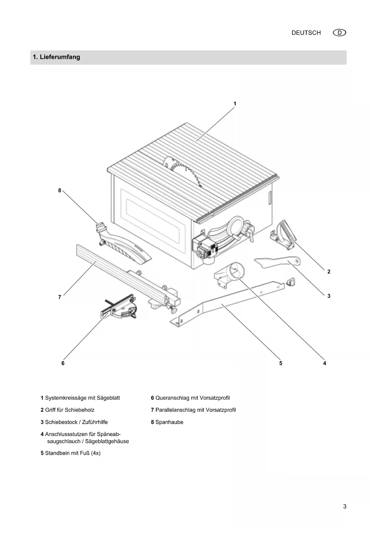 1 Systemkreissäge mit Sägeblatt 2 Griff für Schiebeholz 3 Schiebestock / Zuführhilfe 4 Anschlussstutzen für Späneab- saugschlauch / Sägeblattgehäuse 5 Standbein mit Fuß (4x) 6 Queranschlag mit Vorsatzprofil 7 Parallelanschlag mit Vorsatzprofil 8 Spanhaube I_0015de2A.fm 27.4.11 OriginalbetriebsanleitungDEUTSCH