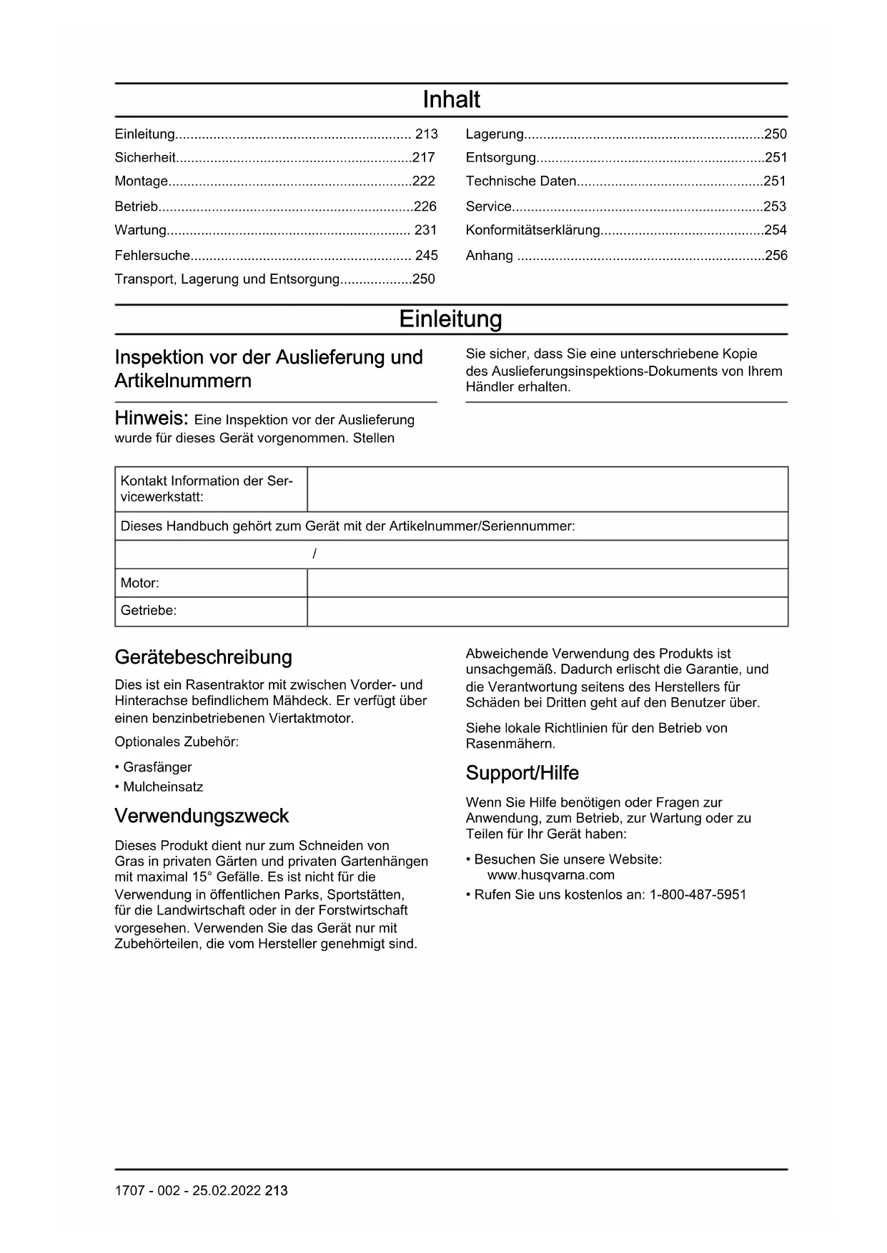 1707 - 002 - 25.02.2022 253Konformitätserklärung 254 1707 - 002 - 25.02.2022EU-Konformitätserklärung Wir, Husqvarna AB, SE 561 82 Huskvarna, SCHWEDEN, erklären in alleiniger Verantwortung, dass das beschriebene Gerät: Beschreibung Mit Verbrennungsmotor betriebener Aufsitzrasenmäher, Bediener sit- zend Marke Husqvarna Plattform/Typ/Modell TS142L Charge Seriennummer ab Erfüllt die folgenden EU-Vorschriften und -Richtlinien: Richtlinie/Vorschrift Beschreibung 2006/42/EG „über Maschinen“ 2011/65/EU „Beschränkung der Verwendung bestimmter gefährlicher Stoffe“ 2014/30/EU „über elektromagnetische Verträglichkeit“ 2000/14/EG, 2005/88/EG „über umweltbelastende Geräuschemissionen“ Harmonisierte Normen und/oder technische Spezifikationen gelten wie folgt: EN ISO
