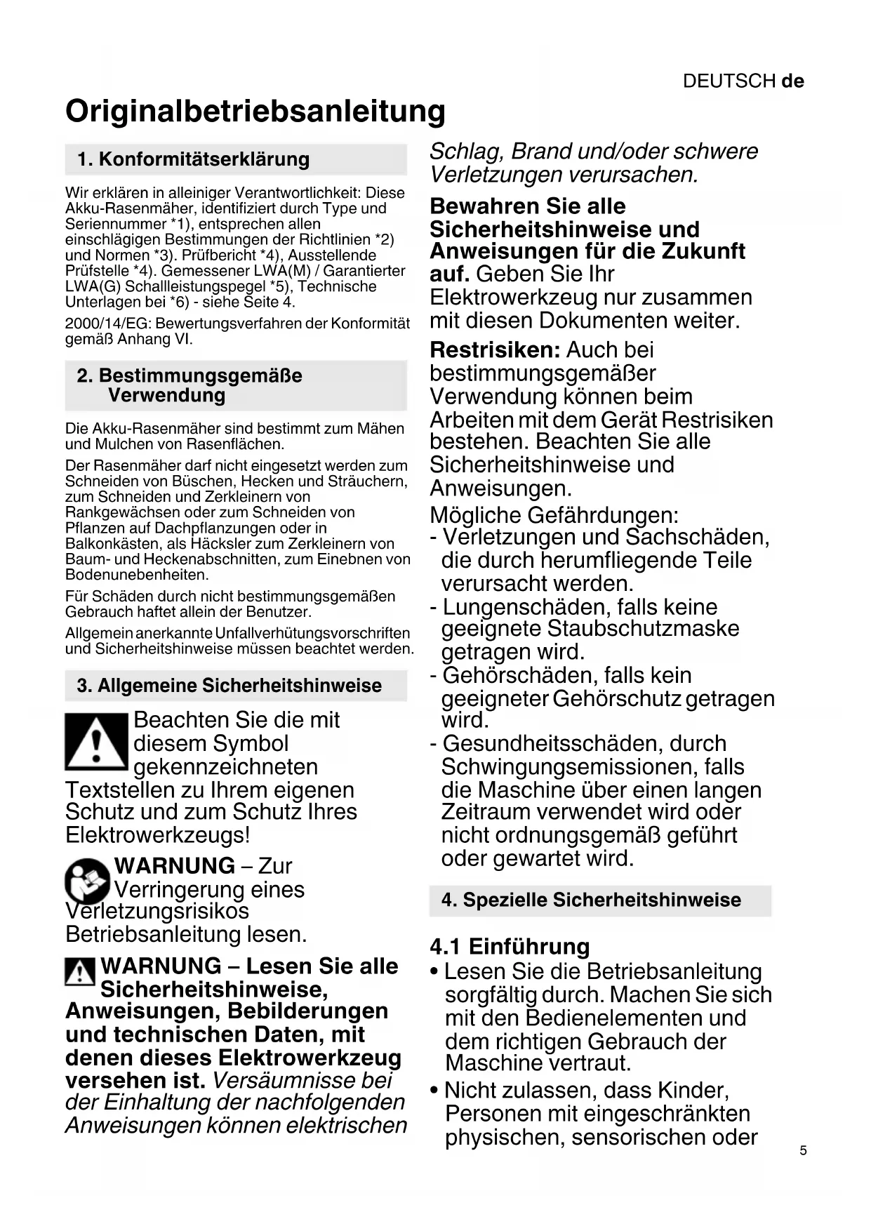 Originalbetriebsanleitung Wir erklären in alleiniger Verantwortlichkeit: Diese Akku-Rasenmäher, identifiziert durch Type und Seriennummer *1), entsprechen allen einschlägigen Bestimmungen der Richtlinien *2) und Normen *3). Prüfbericht *4), Ausstellende Prüfstelle *4). Gemessener LWA(M) / Garantierter LWA(G) Schallleistungspegel *5), Technische Unterlagen bei *6) - siehe Seite 4. 2000/14/EG: Bewertungsverfahren der Konformität gemäß Anhang VI. Die Akku-Rasenmäher sind bestimmt zum Mähen und Mulchen von Rasenflächen. Der Rasenmäher darf nicht eingesetzt werden zum Schneiden von Büschen, Hecken und Sträuchern, zum Schneiden und Zerkleinern von Rankgewächsen oder zum Schneiden von Pflanzen auf Dachpflanzungen oder in Balkonkästen, als Häcksler zum Zerkleinern von Baum- und Heckenabschnitten, zum Einebnen von Bodenunebenheiten. Für Schäden durch nicht bestimmungsgemäßen Gebrauch haftet allein der Benutzer. Allgemein anerkannte Unfallverhütungsvorschriften und Sicherheitshinweise müssen beachtet werden. Beachten Sie die mit diesem Symbol gekennzeichneten Textstellen zu Ihrem eigenen Schutz und zum Schutz Ihres Elektrowerkzeugs! WARNUNG – Zur Verringerung eines Verletzungsrisikos Betriebsanleitung lesen. WARNUNG – Lesen Sie alle Sicherheitshinweise, Anweisungen, Bebilderungen und technischen Daten, mit denen dieses Elektrowerkzeug versehen ist. Versäumnisse bei der Einhaltung der nachfolgenden Anweisungen können elektrischen Schlag, Brand und/oder schwere Verletzungen verursachen. Bewahren Sie alle Sicherheitshinweise und Anweisungen für die Zukunft auf. Geben Sie Ihr Elektrowerkzeug nur zusammen mit diesen Dokumenten weiter. Restrisiken: Auch bei bestimmungsgemäßer Verwendung können beim Arbeiten mit dem Gerät Restrisiken bestehen. Beachten Sie alle Sicherheitshinweise und Anweisungen. Mögliche Gefährdungen: - Verletzungen und Sachschäden, die durch herumfliegende Teile verursacht werden. - Lungenschäden, falls keine geeignete Staubschutzmaske getragen wird. - Gehörschäden, falls kein geeigneter Gehörschutz getragen wird. - Gesundheitsschäden, durch Schwingungsemissionen, falls die Maschine über einen langen Zeitraum verwendet wird oder nicht ordnungsgemäß geführt oder gewartet wird.