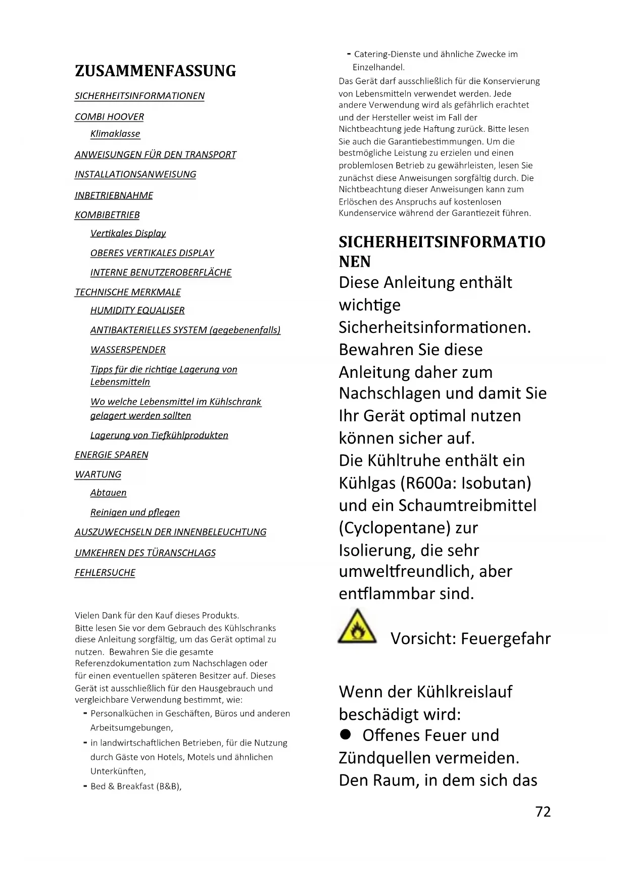 Vielen Dank für den Kauf dieses Produkts. Bitte lesen Sie vor dem Gebrauch des Kühlschranks diese Anleitung sorgfältig, um das Gerät optimal zu nutzen. Bewahren Sie die gesamte Referenzdokumentation zum Nachschlagen oder für einen eventuellen späteren Besitzer auf. Dieses Gerät ist ausschließlich für den Hausgebrauch und vergleichbare Verwendung bestimmt, wie: - Personalküchen in Geschäften, Büros und anderen Arbeitsumgebungen, - in landwirtschaftlichen Betrieben, für die Nutzung durch Gäste von Hotels, Motels und ähnlichen Unterkünften, - Bed & Breakfast (B&B), - Catering-Dienste und ähnliche Zwecke im Einzelhandel. Das Gerät darf ausschließlich für die Konservierung von Lebensmitteln verwendet werden. Jede andere Verwendung wird als gefährlich erachtet und der Hersteller weist im Fall der Nichtbeachtung jede Haftung zurück. Bitte lesen Sie auch die Garantiebestimmungen. Um die bestmögliche Leistung zu erzielen und einen problemlosen Betrieb zu gewährleisten, lesen Sie zunächst diese Anweisungen sorgfältig durch. Die Nichtbeachtung dieser Anweisungen kann zum Erlöschen des Anspruchs auf kostenlosen Kundenservice während der Garantiezeit führen. SICHERHEITSINFORMATIO NEN Diese Anleitung enthält wichtige Sicherheitsinformationen. Bewahren Sie diese Anleitung daher zum Nachschlagen und damit Sie Ihr Gerät optimal nutzen können sicher auf. Die Kühltruhe enthält ein Kühlgas (R600a: Isobutan) und ein Schaumtreibmittel (Cyclopentane) zur Isolierung, die sehr umweltfreundlich, aber entflammbar sind. Vorsicht: Feuergefahr Wenn der Kühlkreislauf beschädigt wird: Offenes Feuer und Zündquellen vermeiden. Den Raum, in dem sich das73 Gerät befindet, gut lüften. WARNUNG! Vorsicht beim Reinigen/Tragen des Geräts, sodass das Metall der Kühlschlaufen nicht berührt wird, da dies Finger und Hände verletzen oder das Gerät beschädigen könnte. Dieses Gerät ist nicht geeignet, um darauf oder darunter weitere Geräte zu stapeln. Nicht auf dem Gerät sitzen oder stehen, da es dafür nicht geeignet ist. Dies könnte zu Personenschäden führen oder das Gerät beschädigen. Darauf achten, dass das Stromkabel während und nach dem Tragen/Verschieben des Geräts nicht darunter stecken bleibt, damit es nicht beschädigt oder zerschnitten wird. Beim Aufstellen des Geräts darauf achten, dass der Fußboden, Leitungen, Wandverkleidungen usw. nicht beschädigt werden. Gerät nicht verschieben, indem an der Klappe oder am Griff gezogen wird. Erlauben Sie Kindern nicht mit dem Gerät zu spielen oder an den Bedienknöpfen herumzuspielen. Unser Unternehmen übernimmt keine Haftung, falls diese Anweisungen nicht befolgt werden. Das Gerät nicht in Umgebungen mit feuchter, öliger oder staubiger Atmosphäre installieren sowie vor direkter Sonneneinstrahlung und Wasser schützen. Das Gerät nicht in der Nähe von Hitzequellen oder entflammbaren Materialien installieren. Bei einem Stromausfall nicht die Klappe öffnen. Dauert der Stromausfall weniger als 20 Stunden an, wird die Tiefkühlware nicht beeinträchtigt. Dauert der Stromausfall länger, sollten die Lebensmittel überprüft und sofort verzehrt oder gekocht und erneut eingefroren werden. Lässt sich die Klappe der74 Kühltruhe schwierig öffnen, nachdem Sie diese gerade geschlossen haben, so ist dies normal. Dies liegt am Druckausgleich, der hergestellt wird. Die Klappe lässt sich normalerweise nach wenigen Minuten wieder öffnen. Das Gerät erst dann an die Stromversorgung anschließen, wenn sämtliches Verpackungsmaterial und Transportschutzvorrichtung en entfernt wurden. Das Gerät vor dem Einschalten mindestens vier Stunden lang stehen lassen, wenn es im Liegen transportiert wurde, damit sich das Kompressoröl absetzen kann. Diese Kühltruhe darf nur für den vorgesehenen Zweck (z.B. Lagern und Einfrieren von Lebensmitteln) verwendet werden. Keine Medikamente oder Materialien für wissenschaftliche Forschungen aufbewahren. Wird Material gelagert, das eine strenge Kontrolle der Lagertemperatur erfordert, so kann sich die Qualität verschlechtern oder es kann eine unvorhergesehene Reaktion auftreten, die zu Risiken führen kann. Vor jedem Eingriff am Gerät den Netzstecker ziehen. Bei der Lieferung überprüfen, ob das Produkt nicht beschädigt ist und ob alle Teile und Zubehör unversehrt sind. Wenn Sie am Kühlsystem ein Leck feststellen, nicht die Netzsteckdose berühren und unbedingt offenes Feuer vermeiden. Das Fenster öffnen und den Raum gut lüften. Wenden Sie sich an den Kundenservice, um das Gerät reparieren zu lassen. Zum Anschluss keine Verlängerungskabel und Adapter verwenden. Das Netzkabel nicht stark spannen oder biegen und den Netzstecker nicht mit nassen Händen berühren. Den Netzstecker und/oder das Netzkabel nicht75 beschädigen - Stromschlag- und Brandgefahr! Ein beschädigtes Netzkabel muss vom Hersteller oder dem zugelassenen Kundendienst oder ähnlich qualifizierter Person ausgewechselt werden, um Gefahren vorzubeugen. Keine brennbaren und hoch flüchtigen Substanzen wie Äther, Benzin, Flüssiggas, Propan, Sprühdosen, Klebstoffe, reinen Alkohol usw. in der Kühltruhe aufbewahren - Explosionsgefahr! In der Nähe der Kühltruhe keine brennbaren Sprays wie z.B. Farbspraydosen aufbewahren. Es besteht Explosions- oder Brandgefahr. Keine Gegenstände oder mit Wasser gefüllten Behälter auf das Gerät stellen. Keine Verlängerungskabel und Mehrfachsteckleisten verwenden. Gerät nicht durch Verbrennen entsorgen. Darauf achten, dass die Kühlschleife des Geräts während des Transports oder im Betrieb nicht beschädigt wird. Bei einer Beschädigung das Gerät keinem offenen Feuer oder möglichen Zündquellen aussetzen und den Raum, in dem sich das Gerät befindet, sofort gut lüften. Das Kühlsystem an der Rückseite und im Inneren des Geräts enthält ein Kältemittel. Es muss daher darauf geachtet werden, die Leitungen nicht zu beschädigen. Im Inneren des Gefriergeräts keine elektrischen Geräte b