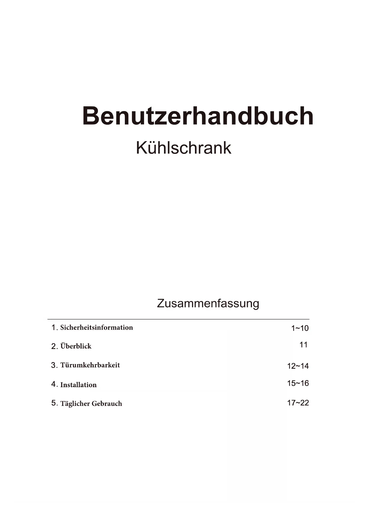 12~14 15~16 17~22 Benutzerhandbuch KühlschrankVielen Dank für den Kauf dieses Produkts. Bevor Sie den Kühlschrank benutzen, lesen Sie bitte aufmerksam diese Bedienungsanleitung, um das Gerät optimal zu nutzen. Bewahren Sie alle Unterlagen für spätere Zwecke oder Nachbesitzer auf. Dieses Produkt ist nur für Privathaushalte oder ähnliche Anwendungszwecke vorgesehen: - Personalküche in Geschäften, Büros und anderen Arbeitsumgebungen - landwirtschaftliche Betriebe, Hotels, Motels und andere Wohnumgebungen - Frühstückspensionen - Party-Servicedienste und ähnliche nicht dem Einzelverkauf dienende Anwendungen. Die ses Gerät darf nur zur Lagerung von Lebensmitteln benutzt werden. Jede andere Benutzung gilt als gefährlich und führt zum Haftungsausschluss des Herstellers. Darüber hinaus sollten Sie die Garantiebedingungen beachten. SICHERHEITSHINWEISE Bitte lesen Sie die Bedienungs- und Installationsanleitung sorgfältig durch! Sie enthalten wichtige Informationen, wie das Gerät installiert, verwendet und gewartet werden soll. Der Hersteller haftet nicht, wenn Sie die Anweisungen und Warnungen nicht beachten. Bewahren Sie die gesamte Dokumentation zum Nachschlagen oder für einen eventuellen späteren Besitzer auf.