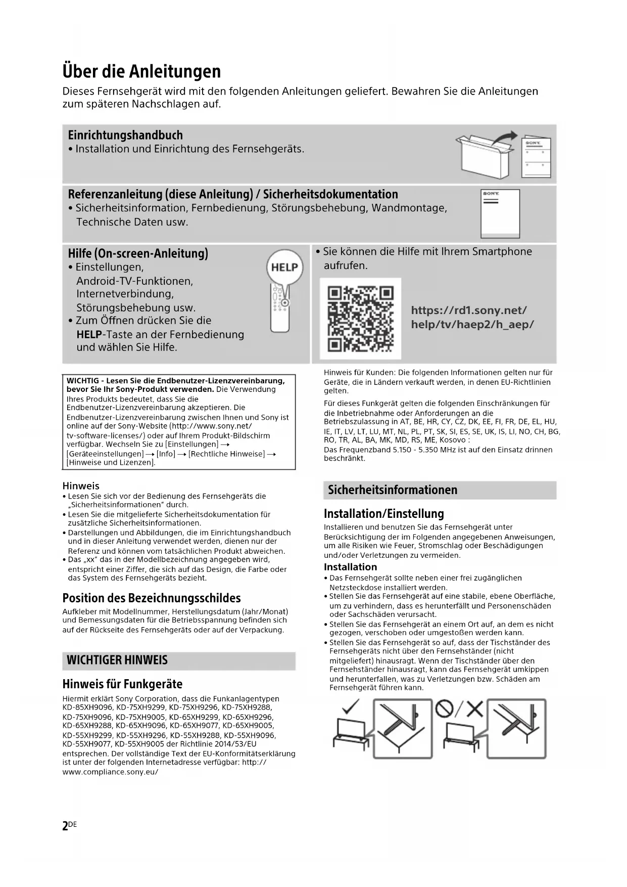 - Lesen Sie sich vor der Bedienung des Fernsehgeräts die „Sicherheitsinformationen“ durch.• Lesen Sie die mitgelieferte Sicherheitsdokumentation für zusätzliche Sicherheitsinformationen.• Darstellungen und Abbildungen, die im Einrichtungshandbuch und in dieser Anleitung verwendet werden, dienen nur der Referenz und können vom tatsächlichen Produkt abweichen.• Das „xx“ das in der Modellbezeichnung angegeben wird, entspricht einer Ziffer, die sich auf das Design, die Farbe oder das System des Fernsehgeräts bezieht. Position des Bezeichnungsschildes Aufkleber mit Modellnummer, Herstellungsdatum (Jahr/Monat) und Bemessungsdaten für die Betriebsspannung befinden sich auf der Rückseite des Fernsehgeräts oder auf der Verpackung. WICHTIGER HINWEIS Hinweis für Funkgeräte Hiermit erklärt Sony Corporation, dass die Funkanlagentypen KD-85XH9096, KD-75XH9299, KD-75XH9296, KD-75XH9288, KD-75XH9096, KD-75XH9005, KD-65XH9299, KD-65XH9296, KD-65XH9288, KD-65XH9096, KD-65XH9077, KD-65XH9005, KD-55XH9299, KD-55XH9296, KD-55XH9288, KD-55XH9096, KD-55XH9077, KD-55XH9005 der Richtlinie 2014/53/EU entsprechen. Der vollständige Text der EU-Konformitätserklärung ist unter der folgenden Internetadresse verfügbar: http://www.compliance.sony.eu/Hinweis für Kunden: Die folgenden Informationen gelten nur für Geräte, die in Ländern verkauft werden, in denen EU-Richtlinien gelten.Für dieses Funkgerät gelten die folgenden Einschränkungen für die Inbetriebnahme oder Anforderungen an die Betriebszulassung in AT, BE, HR, CY, CZ, DK, EE, FI, FR, DE, EL, HU, IE, IT, LV, LT, LU, MT, NL, PL, PT, SK, SI, ES, SE, UK, IS, LI, NO, CH, BG, RO, TR, AL, BA, MK, MD, RS, ME, Kosovo :Das Frequenzband 5.150 - 5.350 MHz ist auf den Einsatz drinnen beschränkt. Sicherheitsinformationen Installation/Einstellung Installieren und benutzen Sie das Fernsehgerät unter Berücksichtigung der im Folgenden angegebenen Anweisungen, um alle Risiken wie Feuer, Stromschlag oder Beschädigungen und/oder Verletzungen zu vermeiden. Installation