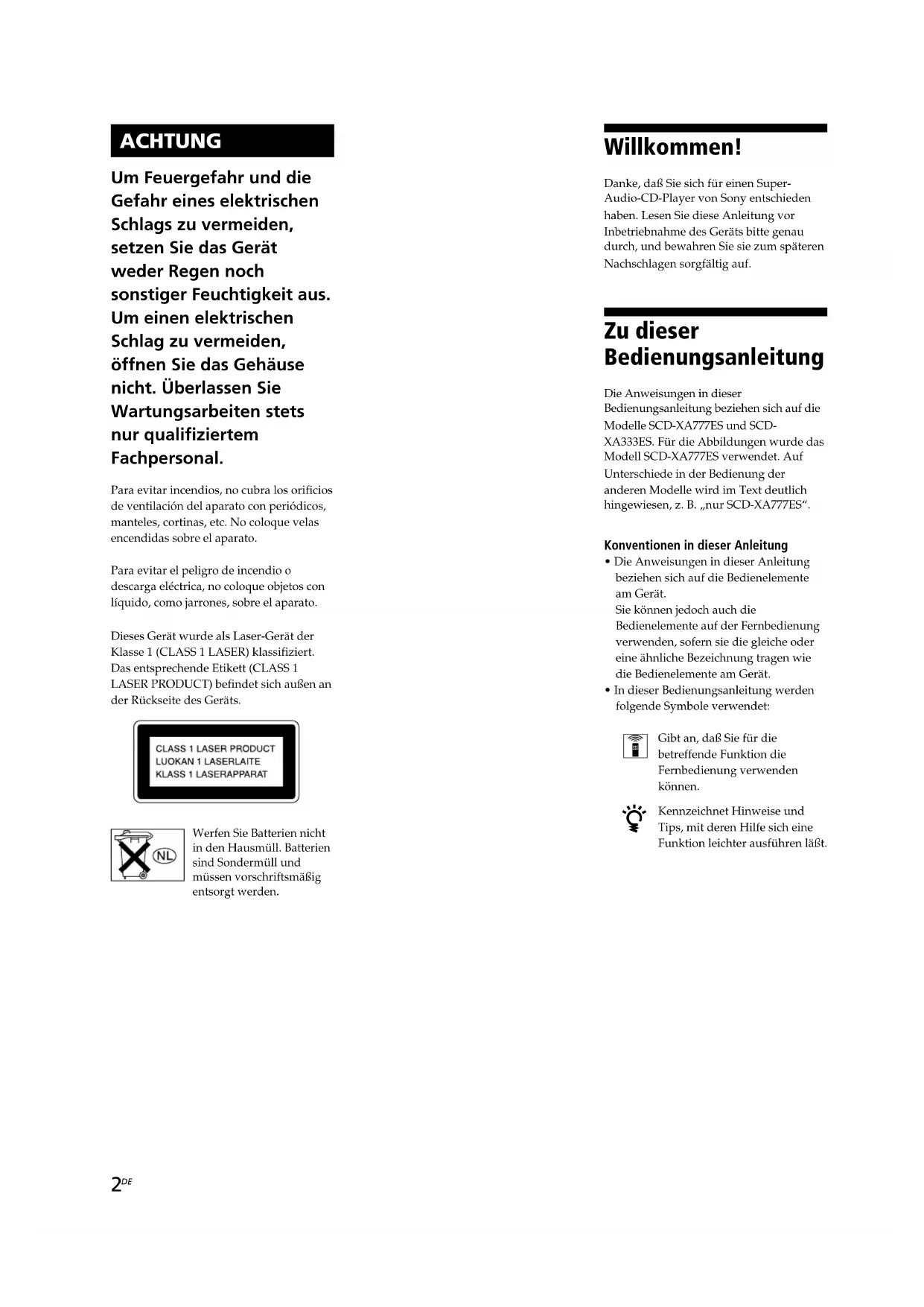 ACHTUNG Um Feuergefahr und die Gefahr eines elektrischen Schlags zu vermeiden, setzen Sie das Gerät weder Regen noch sonstiger Feuchtigkeit aus. Um einen elektrischen Schlag zu vermeiden, öffnen Sie das Gehäuse nicht. Überlassen Sie Wartungsarbeiten stets nur qualifiziertem Fachpersonal. Willkommen! Danke, daß Sie sich für einen Super- Audio-CD-Player von Sony entschieden haben. Lesen Sie diese Anleitung vor Inbetriebnahme des Geräts bitte genau durch, und bewahren Sie sie zum späteren Nachschlagen sorgfältig auf. Zu dieser Bedienungsanleitung Die Anweisungen in dieser Bedienungsanleitung beziehen sich auf die Modelle SCD-XA777ES und SCD- XA333ES. Für die Abbildungen wurde das Modell SCD-XA777ES verwendet. Auf Unterschiede in der Bedienung der anderen Modelle wird im Text deutlich hingewiesen, z. B. „nur SCD-XA777ES“. Konventionen in dieser Anleitung