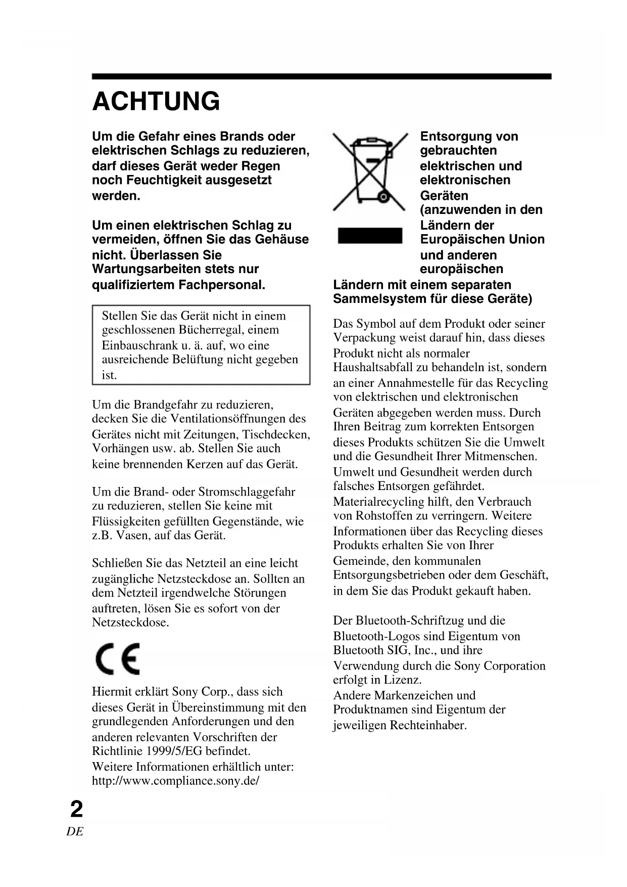 ACHTUNG Um die Gefahr eines Brands oder elektrischen Schlags zu reduzieren, darf dieses Gerät weder Regen noch Feuchtigkeit ausgesetzt werden. Um einen elektrischen Schlag zu vermeiden, öffnen Sie das Gehäuse nicht. Überlassen Sie Wartungsarbeiten stets nur qualifiziertem Fachpersonal. Stellen Sie das Gerät nicht in einem geschlossenen Bücherregal, einem Einbauschrank u. ä. auf, wo eine ausreichende Belüftung nicht gegeben ist. Um die Brandgefahr zu reduzieren, decken Sie die Ventilationsöffnungen des Gerätes nicht mit Zeitungen, Tischdecken, Vorhängen usw. ab. Stellen Sie auch keine brennenden Kerzen auf das Gerät. Um die Brand- oder Stromschlaggefahr zu reduzieren, stellen Sie keine mit Flüssigkeiten gefüllten Gegenstände, wie z.B. Vasen, auf das Gerät. Schließen Sie das Netzteil an eine leicht zugängliche Netzsteckdose an. Sollten an dem Netzteil irgendwelche Störungen auftreten, lösen Sie es sofort von der Netzsteckdose. Hiermit erklärt Sony Corp., dass sich dieses Gerät in Übereinstimmung mit den grundlegenden Anforderungen und den anderen relevanten Vorschriften der Richtlinie 1999/5/EG befindet. Weitere Informationen erhältlich unter: http://www.compliance.sony.de/ Der Bluetooth-Schriftzug und die Bluetooth-Logos sind Eigentum von Bluetooth SIG, Inc., und ihre Verwendung durch die Sony Corporation erfolgt in Lizenz. Andere Markenzeichen und Produktnamen sind Eigentum der jeweiligen Rechteinhaber. Entsorgung von gebrauchten elektrischen und elektronischen Geräten (anzuwenden in den Ländern der Europäischen Union und anderen europäischen Ländern mit einem separaten Sammelsystem für diese Geräte) Das Symbol auf dem Produkt oder seiner Verpackung weist darauf hin, dass dieses Produkt nicht als normaler Haushaltsabfall zu behandeln ist, sondern an einer Annahmestelle für das Recycling von elektrischen und elektronischen Geräten abgegeben werden muss. Durch Ihren Beitrag zum korrekten Entsorgen dieses Produkts schützen Sie die Umwelt und die Gesundheit Ihrer Mitmenschen. Umwelt und Gesundheit werden durch falsches Entsorgen gefährdet. Materialrecycling hilft, den Verbrauch von Rohstoffen zu verringern. Weitere Informationen über das Recycling dieses Produkts erhalten Sie von Ihrer Gemeinde, den kommunalen Entsorgungsbetrieben oder dem Geschäft, in dem Sie das Produkt gekauft haben.3