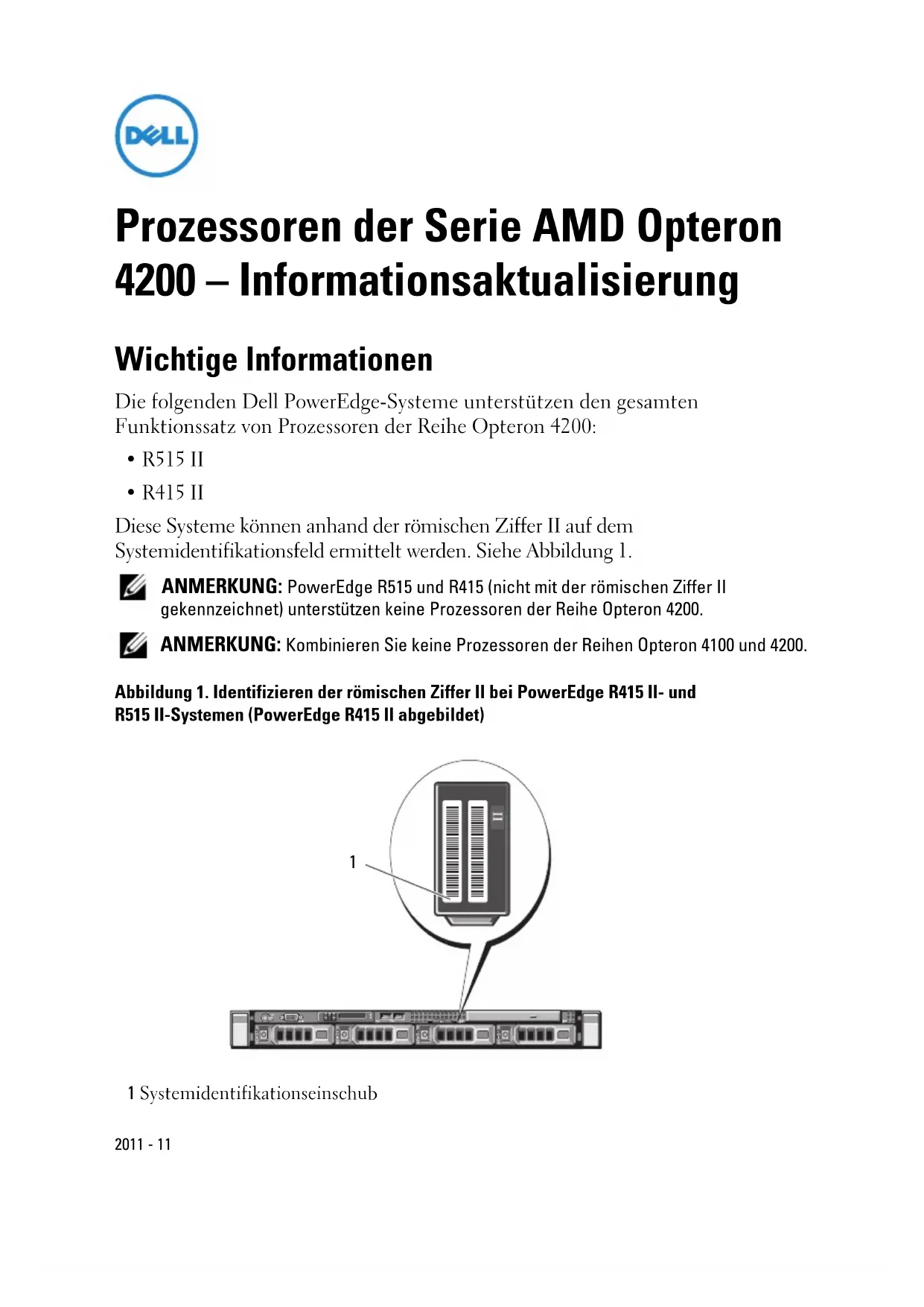- R415 II Diese Systeme können anhand der römischen Ziffer II auf dem Systemidentifikationsfeld ermittelt werden. Siehe Abbildung 1. ANMERKUNG: PowerEdge R515 und R415 (nicht mit der römischen Ziffer II gekennzeichnet) unterstützen keine Prozessoren der Reihe Opteron 4200. ANMERKUNG: Kombinieren Sie keine Prozessoren der Reihen Opteron 4100 und 4200. Abbildung 1. Identifizieren der römischen Ziffer II bei PowerEdge R415 II- und R515 II-Systemen (PowerEdge R415 II abgebildet) 1 Systemidentifikationseinschub