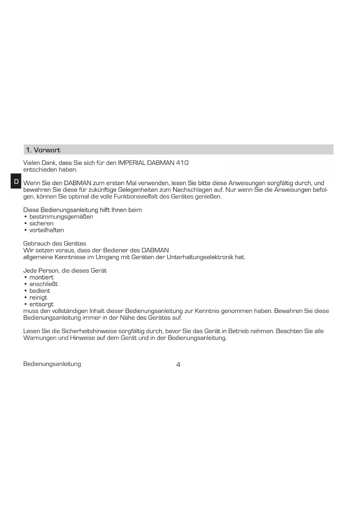 Vielen Dank, dass Sie sich für den IMPERIAL DABMAN 410 entschieden haben. Wenn Sie den DABMAN zum ersten Mal verwenden, lesen Sie bitte diese Anweisungen sorgfältig durch, und bewahren Sie diese für zukünftige Gelegenheiten zum Nachschlagen auf. Nur wenn Sie die Anweisungen befol- gen, können Sie optimal die volle Funktionsvielfalt des Gerätes genießen. Diese Bedienungsanleitung hilft Ihnen beim