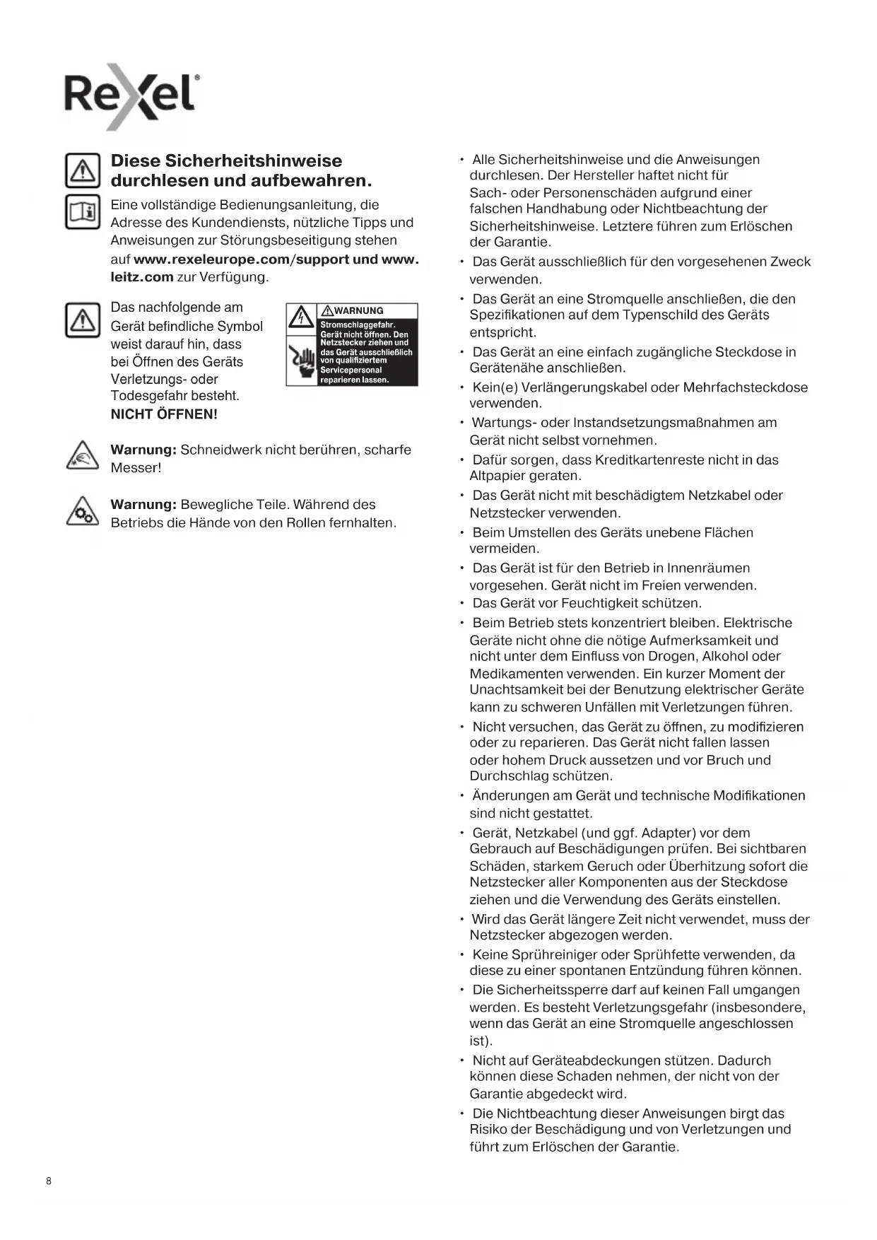 Diese Sicherheitshinweise durchlesen und aufbewahren. Eine vollständige Bedienungsanleitung, die Adresse des Kundendiensts, nützliche Tipps und Anweisungen zur Störungsbeseitigung stehen auf www.rexeleurope.com/support und www. leitz.com zur Verfügung. Warnung: Schneidwerk nicht berühren, scharfe Messer! Warnung: Bewegliche Teile. Während des Betriebs die Hände von den Rollen fernhalten.999 Losen Schmuck vom Gerät fernhalten. Krawatten und andere lose Kleidung vom Gerät fernhalten. Warnsymbole Langes Haar vom Gerät fernhalten. Nicht in den Einzugsschlitz fassen. Warnsymbole Zufuhrkapazität Keine CDs Keine industriellen Heftklammern über 26 mm Warnung: Bewegliche Teile. Das Gerät ist nicht für die Verwendung durch Kinder vorgesehen. Keine Sprühmittel verwenden. Keine Sprühreiniger oder Sprühfette verwenden, da diese zu einer spontanen Entzündung führen können. Symbol Art Schiebeschalter/ Anzeige Bedientasten Startautomatik und Standby (einmal drücken) Rückwärtsbetrieb Vorwärtsbetrieb Überhitzung (Gerät abkühlen lassen) Überlastungs-/ Stauanzeige (weniger Blätter einlegen/Stau beseitigen) Modelle mit Bedientasten Symbol Art Schiebeschalter/ Anzeige Schiebeschalter Betrieb automatisch starten Rückwärtsbetrieb Vorwärtsbetrieb Statusanzeigen Aus Betriebsbereit (darauf achten, dass das Schneidwerk richtig auf dem Abfallbehälter sitzt und der Schiebeschalter auf „Betrieb automatisch starten“ steht) Überhitzung (Gerät abkühlen lassen) Bedienelemente und Anzeigen Modelle mit Schiebeschalter Keine Kreditkarten Zubehör Nur Originalzubehör von Rexel verwenden: Schmiermittelblätter (20) - 2101949 Schmiermittelblätter (12) - 210194810 Medien zerkleinern KANN Folgendes zerkleinern: