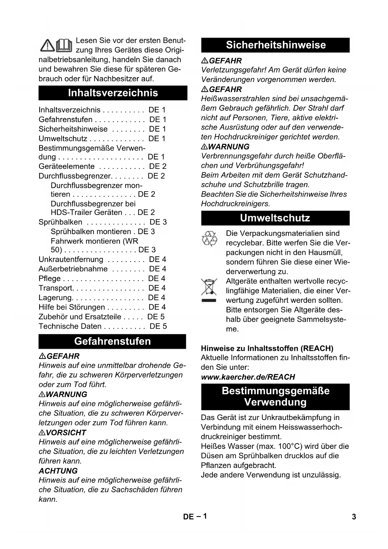 WR 20 WR 50 59670710 06/16 Deutsch 3 English 8 Français 13 Italiano 18 Nederlands 23 Español 28 Português 33 Dansk 38 Norsk 43 Svenska 47 Русский 522– 1 Lesen Sie vor der ersten Benut- zung Ihres Gerätes diese Origi- nalbetriebsanleitung, handeln Sie danach und bewahren Sie diese für späteren Ge- brauch oder für Nachbesitzer auf. GEFAHR Hinweis auf eine unmittelbar drohende Ge- fahr, die zu schweren Körperverletzungen oder zum Tod führt. 몇 WARNUNG Hinweis auf eine möglicherweise gefährli- che Situation, die zu schweren Körperver- letzungen oder zum Tod führen kann. 몇 VORSICHT Hinweis auf eine möglicherweise gefährli- che Situation, die zu leichten Verletzungen führen kann. ACHTUNG Hinweis auf eine möglicherweise gefährli- che Situation, die zu Sachschäden führen kann. GEFAHR Verletzungsgefahr! Am Gerät dürfen keine Veränderungen vorgenommen werden. GEFAHR Heißwasserstrahlen sind bei unsachgemä- ßem Gebrauch gefährlich. Der Strahl darf nicht auf Personen, Tiere, aktive elektri- sche Ausrüstung oder auf den verwende- ten Hochdruckreiniger gerichtet werden. 몇 WARNUNG Verbrennungsgefahr durch heiße Oberflä- chen und Verbrühungsgefahr! Beim Arbeiten mit dem Gerät Schutzhand- schuhe und Schutzbrille tragen. Beachten Sie die Sicherheitshinweise Ihres Hochdruckreinigers. Die Verpackungsmaterialien sind recyclebar. Bitte werfen Sie die Ver- packungen nicht in den Hausmüll, sondern führen Sie diese einer Wie- derverwertung zu. Altgeräte enthalten wertvolle recyc- lingfähige Materialien, die einer Ver- wertung zugeführt werden sollten. Bitte entsorgen Sie Altgeräte des- halb über geeignete Sammelsyste- me. Hinweise zu Inhaltsstoffen (REACH) Aktuelle Informationen zu Inhaltsstoffen fin- den Sie unter: www.kaercher.de/REACH Das Gerät ist zur Unkrautbekämpfung in Verbindung mit einem Heisswasserhoch- druckreiniger bestimmt. Heißes Wasser (max. 100°C) wird über die Düsen am Sprühbalken drucklos auf die Pflanzen aufgebracht. Jede andere Verwendung ist unzulässig. Inhaltsverzeichnis Inhaltsverzeichnis ... DE 1 Gefahrenstufen ... DE 1 Sicherheitshinweise ... DE 1 Umweltschutz ... DE 1 Bestimmungsgemäße Verwen- dung ... DE 1 Geräteelemente ... DE 2 Durchflussbegrenzer... DE 2 Durchflussbegrenzer mon- tieren ... DE 2 Durchflussbegrenzer bei HDS-Trailer Geräten ... DE 2 Sprühbalken ... DE 3 Sprühbalken montieren . DE 3 Fahrwerk montieren (WR