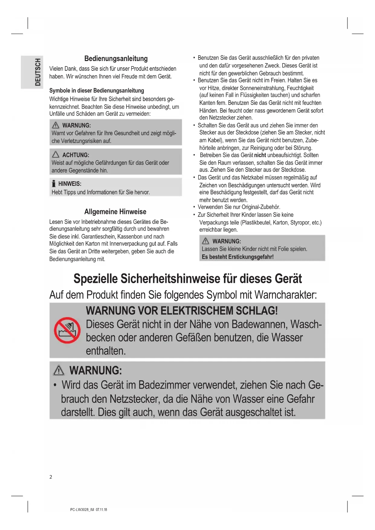- Wird das Gerät im Badezimmer verwendet, ziehen Sie nach Ge- brauch den Netzstecker, da die Nähe von Wasser eine Gefahr darstellt. Dies gilt auch, wenn das Gerät ausgeschaltet ist.3 PC-LW3028_IM 07.11.18 WARNUNG: