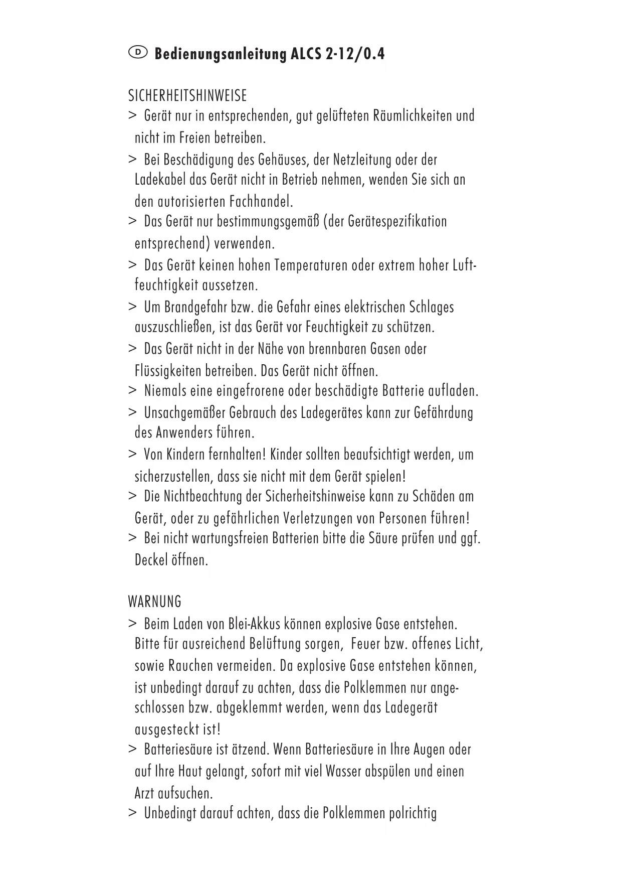 Bedienungsanleitung ALCS 2-12/0.4 SICHERHEITSHINWEISE > Gerät nur in entsprechenden, gut gelüfteten Räumlichkeiten und nicht im Freien betreiben. > Bei Beschädigung des Gehäuses, der Netzleitung oder der Ladekabel das Gerät nicht in Betrieb nehmen, wenden Sie sich an den autorisierten Fachhandel. > Das Gerät nur bestimmungsgemäß (der Gerätespezifikation entsprechend) verwenden. > Das Gerät keinen hohen Temperaturen oder extrem hoher Luft- feuchtigkeit aussetzen. > Um Brandgefahr bzw. die Gefahr eines elektrischen Schlages auszuschließen, ist das Gerät vor Feuchtigkeit zu schützen. > Das Gerät nicht in der Nähe von brennbaren Gasen oder Flüssigkeiten betreiben. Das Gerät nicht öffnen. > Niemals eine eingefrorene oder beschädigte Batterie aufladen. > Unsachgemäßer Gebrauch des Ladegerätes kann zur Gefährdung des Anwenders führen. > Von Kindern fernhalten! Kinder sollten beaufsichtigt werden, um sicherzustellen, dass sie nicht mit dem Gerät spielen! > Die Nichtbeachtung der Sicherheitshinweise kann zu Schäden am Gerät, oder zu gefährlichen Verletzungen von Personen führen! > Bei nicht wartungsfreien Batterien bitte die Säure prüfen und ggf. Deckel öffnen. WARNUNG > Beim Laden von Blei-Akkus können explosive Gase entstehen. Bitte für ausreichend Belüftung sorgen, Feuer bzw. offenes Licht, sowie Rauchen vermeiden. Da explosive Gase entstehen können, ist unbedingt darauf zu achten, dass die Polklemmen nur ange- schlossen bzw. abgeklemmt werden, wenn das Ladegerät ausgesteckt ist! > Batteriesäure ist ätzend. Wenn Batteriesäure in Ihre Augen oder auf Ihre Haut gelangt, sofort mit viel Wasser abspülen und einen Arzt aufsuchen. > Unbedingt darauf achten, dass die Polklemmen polrichtigkontaktiert werden (rote Polklemme an Pluspol; schwarze Polklemme an Minuspol) > Unbedingt verhindern, dass sich die Polklemmen bei einge- stecktem Netzstecker berühren, da sonst ein Lichtbogen aufgrund des Kurzschlusses entsteht. FUNKTIONSÜBERSICHT > Ladegerät zur Ladung von 2V/6V/12V Blei-Säure / Blei-Gel / Blei-Vlies Akkus > Elektronischer Schutz gegen Kurzschluss, Verpolung und Überladung > Geeignet für Bereitschafts- und Parallel-Betrieb > Ladung nach IU-Kennlinie > Automatische Nachladung > Erhaltungsladung mit Stromanpassung INBETRIEBNAHME Setzen sie den geeigneten Eingangsstecker über den beiden Netzkontakten auf und schieben Sie ihn bis zum Anschlag in der Führung. Achten Sie darauf, dass der Stecker hörbar einrastet. Um den Eingangsstecker zu wechseln, drücken Sie mit einem Stift oder ähnlichem die Arretierungsnase etwas ein und schieben Sie den Stecker wieder zurück.