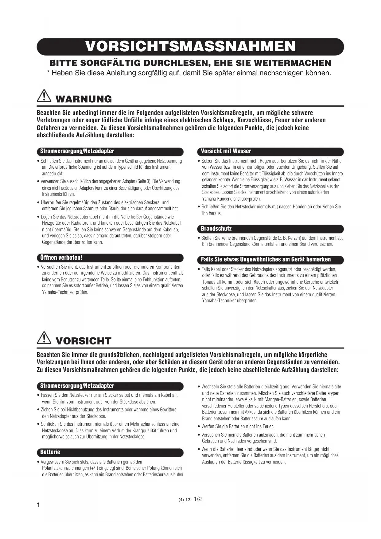 - Heben Sie diese Anleitung sorgfältig auf, damit Sie später einmal nachschlagen können. WARNUNG Beachten Sie unbedingt immer die im Folgenden aufgelisteten Vorsichtsmaßregeln, um mögliche schwere Verletzungen oder sogar tödliche Unfälle infolge eines elektrischen Schlags, Kurzschlüsse, Feuer oder anderen Gefahren zu vermeiden. Zu diesen Vorsichtsmaßnahmen gehören die folgenden Punkte, die jedoch keine abschließende Aufzählung darstellen:• Schließen Sie das Instrument nur an die auf dem Gerät angegebene Netzspannung an. Die erforderliche Spannung ist auf dem Typenschild für das Instrument aufgedruckt.• Verwenden Sie ausschließlich den angegebenen Adapter (Seite 3). Die Verwendung eines nicht adäquaten Adapters kann zu einer Beschädigung oder Überhitzung des Instruments führen.• Überprüfen Sie regelmäßig den Zustand des elektrischen Steckers, und entfernen Sie jeglichen Schmutz oder Staub, der sich darauf angesammelt hat.• Legen Sie das Netzadapterkabel nicht in die Nähe heißer Gegenstände wie Heizgeräte oder Radiatoren, und knicken oder beschädigen Sie das Netzkabel nicht übermäßig. Stellen Sie keine schweren Gegenstände auf dem Kabel ab, und verlegen Sie es so, dass niemand darauf treten, darüber stolpern oder Gegenstände darüber rollen kann.• Versuchen Sie nicht, das Instrument zu öffnen oder die inneren Komponenten zu entfernen oder auf irgendeine Weise zu modifizieren. Das Instrument enthält keine vom Benutzer zu wartenden Teile. Sollte einmal eine Fehlfunktion auftreten, so nehmen Sie es sofort außer Betrieb, und lassen Sie es von einem qualifizierten Yamaha-Techniker prüfen.• Setzen Sie das Instrument nicht Regen aus, benutzen Sie es nicht in der Nähe von Wasser bzw. in einer dampfigen oder feuchten Umgebung. Stellen Sie auf dem Instrument keine Behälter mit Flüssigkeit ab, die durch Verschütten ins Innere gelangen könnte. Wenn eine Flüssigkeit wie z. B. Wasser in das Instrument gelangt, schalten Sie sofort die Stromversorgung aus und ziehen Sie das Netzkabel aus der Steckdose. Lassen Sie das Instrument anschließend von einem autorisierten Yamaha-Kundendienst überprüfen.• Schließen Sie den Netzstecker niemals mit nassen Händen an oder ziehen Sie ihn heraus.• Stellen Sie keine brennenden Gegenstände (z. B. Kerzen) auf dem Instrument ab. Ein brennender Gegenstand könnte umfallen und einen Brand verursachen.• Falls Kabel oder Stecker des Netzadapters abgenutzt oder beschädigt werden, oder falls es während des Gebrauchs des Instruments zu einem plötzlichen Tonausfall kommt oder sich Rauch oder ungewöhnliche Gerüche entwickeln, schalten Sie unverzüglich den Netzschalter aus, ziehen Sie den Netzadapter aus der Steckdose, und lassen Sie das Instrument von einem qualifizierten Yamaha-Techniker überprüfen. VORSICHT Beachten Sie immer die grundsätzlichen, nachfolgend aufgelisteten Vorsichtsmaßregeln, um mögliche körperliche Verletzungen bei Ihnen oder anderen, oder aber Schäden an diesem Gerät oder an anderen Gegenständen zu vermeiden. Zu diesen Vorsichtsmaßnahmen gehören die folgenden Punkte, die jedoch keine abschließende Aufzählung darstellen: