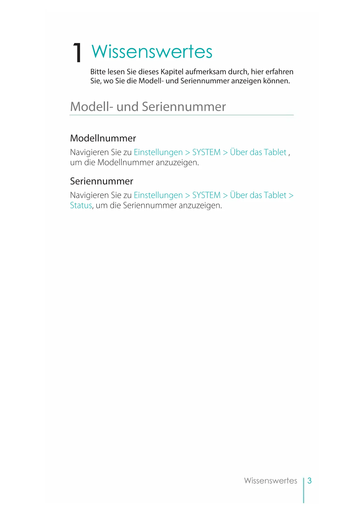 - Copyright und Warenzeichen Wissenswertes Wissenswertes Bitte lesen Sie dieses Kapitel aufmerksam durch, hier erfahren Sie, wo Sie die Modell- und Seriennummer anzeigen können. Modell- und Seriennummer Modellnummer Navigieren Sie zu Einstellungen > SYSTEM > Über das Tablet , um die Modellnummer anzuzeigen. Seriennummer Navigieren Sie zu Einstellungen > SYSTEM > Über das Tablet > Status, um die Seriennummer anzuzeigen. p. 383
