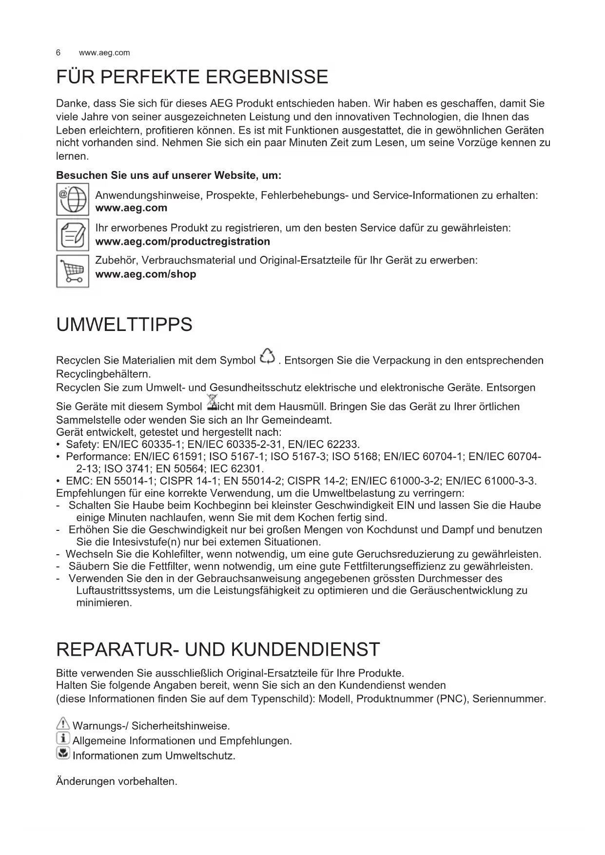 Danke, dass Sie sich für dieses AEG Produkt entschieden haben. Wir haben es geschaffen, damit Sie viele Jahre von seiner ausgezeichneten Leistung und den innovativen Technologien, die Ihnen das Leben erleichtern, profitieren können. Es ist mit Funktionen ausgestattet, die in gewöhnlichen Geräten nicht vorhanden sind. Nehmen Sie sich ein paar Minuten Zeit zum Lesen, um seine Vorzüge kennen zu lernen. Besuchen Sie uns auf unserer Website, um: Anwendungshinweise, Prospekte, Fehlerbehebungs- und Service-Informationen zu erhalten: www.aeg.com Ihr erworbenes Produkt zu registrieren, um den besten Service dafür zu gewährleisten: www.aeg.com/productregistration Zubehör, Verbrauchsmaterial und Original-Ersatzteile für Ihr Gerät zu erwerben: www.aeg.com/shop UMWELTTIPPS Recyclen Sie Materialien mit dem Symbol . Entsorgen Sie die Verpackung in den entsprechenden Recyclingbehältern. Recyclen Sie zum Umwelt- und Gesundheitsschutz elektrische und elektronische Geräte. Entsorgen Sie Geräte mit diesem Symbol nicht mit dem Hausmüll. Bringen Sie das Gerät zu Ihrer örtlichen Sammelstelle oder wenden Sie sich an Ihr Gemeindeamt. Gerät entwickelt, getestet und hergestellt nach: