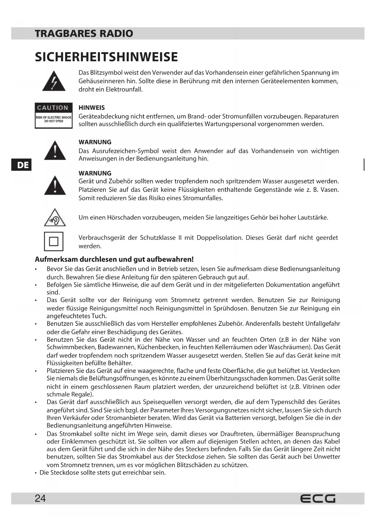 Verpackungspapier und Wellpappe – zum Altpapier geben. Verpackungsfolie, PET-Beutel, Plastikteile – in den Sammelcontainer für Plastik. ENTSORGUNG DES PRODUKTES NACH ABLAUF DER LEBENSDAUER Die Entsorgung der verwendeten elektrischen und elektronischen Geräte (gültig in den Mitgliedsländern der EU und weiteren europäischen Ländern mit dem eingeführten System der Abfalltrennung)Das abgebildete Symbol auf dem Produkt oder auf der Verpackung bedeutet, dass das Produkt nicht als Hausmüll abgegeben werden soll. Das Produkt geben Sie an einem Ort ab, der für das Recycling von elektrischen und elektronischen Geräten bestimmt ist. Die richtige Entsorgung des Produktes schützt Sie vor negativen Einüssen auf die menschliche Gesundheit und des Lebensraumes.Das Recycling des Materials trägt zum Schutz der Naturressourcen bei. Mehr Informationen über das Recycling dieses Produktes gibt Ihnen die Kommunalbehörde, Organisationen für die Bearbeitung von Hausabfall oder die Verkaufsstelle, in der Sie das Produkt erworben haben. Dieses Produkt erfüllt die Anforderung der EU-Richtlinien über elektromagnetische Kompatibilität und elektrische Sicherheit. Bedienungsanleitung s. www.ecg-electro.eu. Eine Änderung des Textes und der technischen Parameter vorbehalten. 08/05GB PORTABLE RADIO