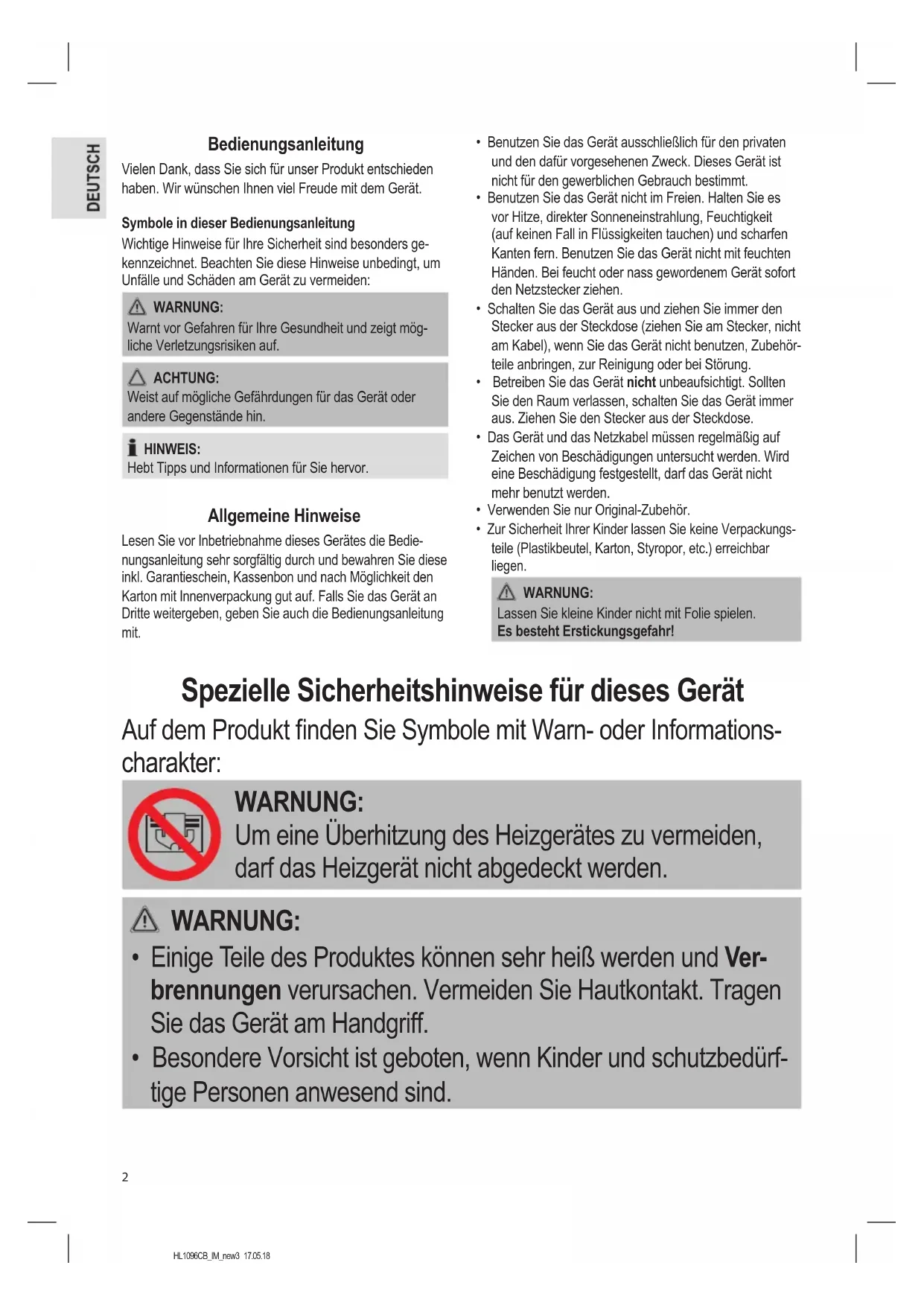 - Auf einen sicheren Abstand zwischen Stromkabel und Gehäuse des Heizgeräts achten.HL1096CB_IM_new3 17.05.18