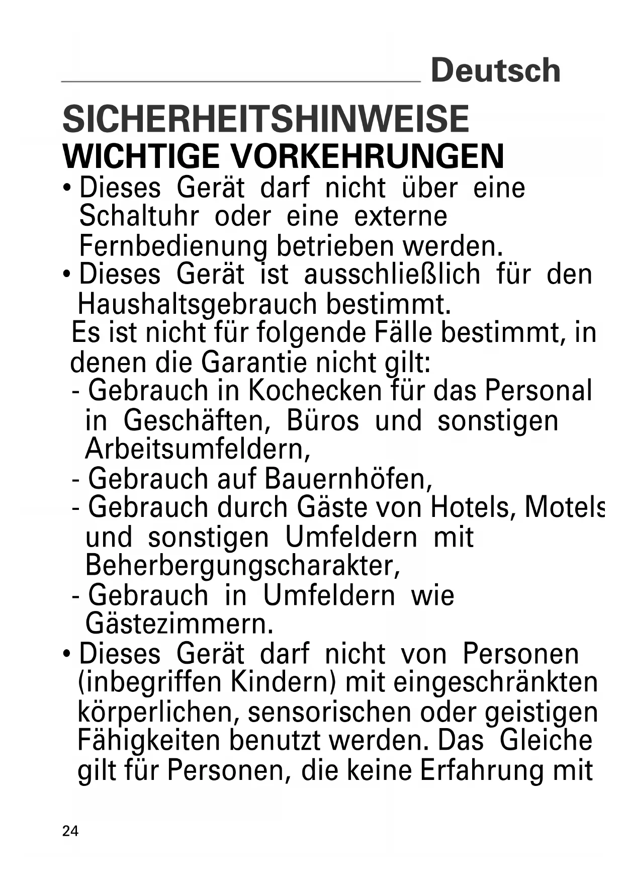 - Dieses Gerät ist ausschließlich für den Haushaltsgebrauch bestimmt. Es ist nicht für folgende Fälle bestimmt, in denen die Garantie nicht gilt: - Gebrauch in Kochecken für das Personal in Geschäften, Büros und sonstigen Arbeitsumfeldern, - Gebrauch auf Bauernhöfen, - Gebrauch durch Gäste von Hotels, Motels und sonstigen Umfeldern mit Beherbergungscharakter, - Gebrauch in Umfeldern wie Gästezimmern.