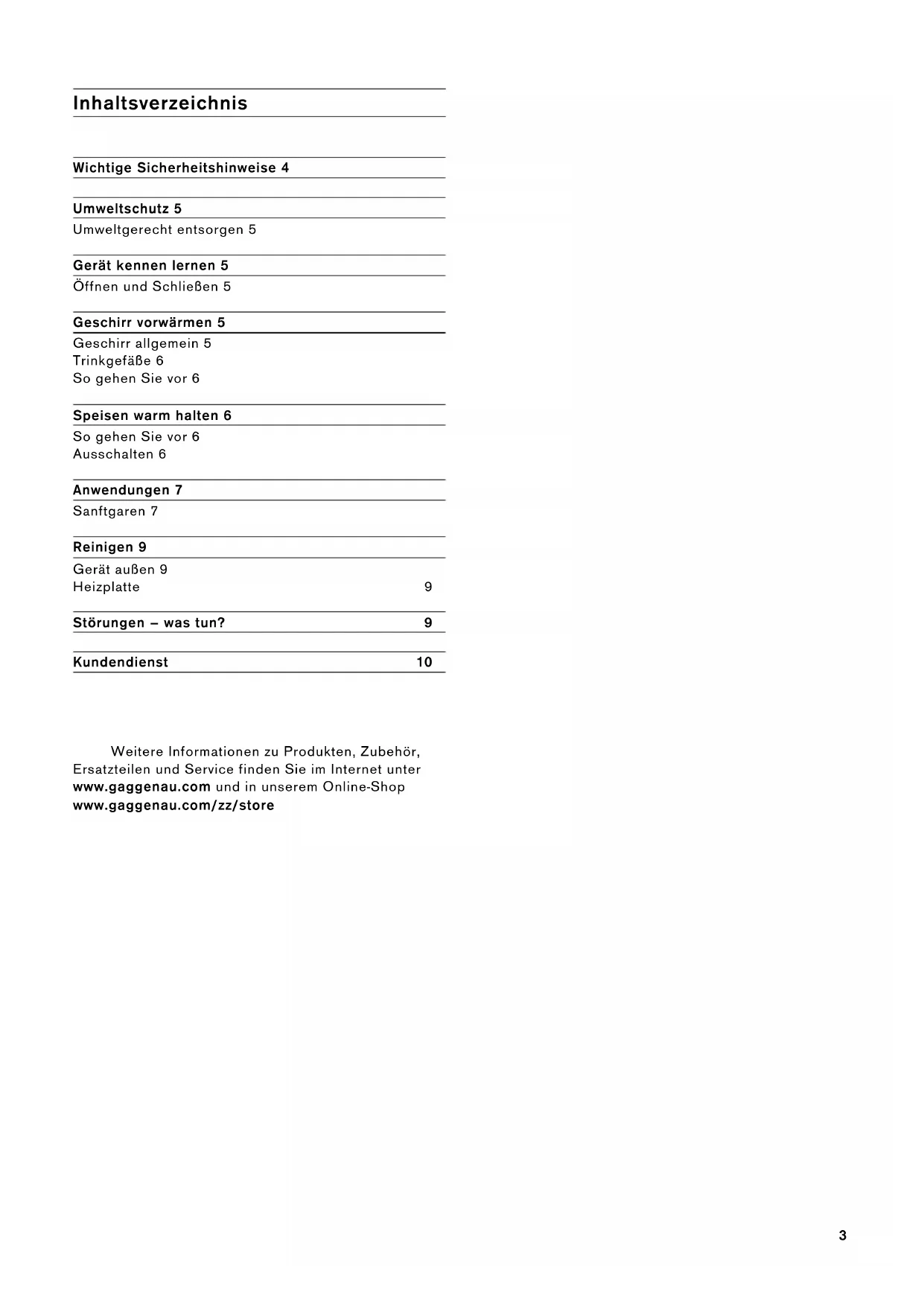 Gaggenau Gaggenau Gebrauchsanleitung Instruction manual Notice d'utilisation Istruzioni per l’uso Gebruiksaanwijzing Instrucciones de uso Instruções de serviço WS 461/462 Wärmeschublade Warming drawer Tiroir chauffant Cassetto termico Warmhoudlade Cajón calientaplatos Gaveta de aquecimento2 Inhaltsverzeichnis 3 Table of contents 11 Table des matières 19 Indice 27 Inhoudsopgave 35 Índice 43 Índice 513 Inhaltsverzeichnis Gebrauchsanleitung Wichtige Sicherheitshinweise 4 Umweltschutz 5 Umweltgerecht entsorgen 5 Gerät kennen lernen 5 Öffnen und Schließen 5 Geschirr vorwärmen 5 Geschirr allgemein 5 Trinkgefäße 6 So gehen Sie vor 6 Speisen warm halten 6 So gehen Sie vor 6 Ausschalten 6 Anwendungen 7 Sanftgaren 7 Reinigen 9 Gerät außen 9 Heizplatte 9 Störungen – was tun? 9 Kundendienst 10 : Weitere Informationen zu Produkten, Zubehör, Ersatzteilen und Service finden Sie im Internet unter www.gaggenau.com und in unserem Online-Shop www.gaggenau.com/zz/store4 m Wichtige Sicherheitshinweise Diese Anleitung sorgfältig lesen. Nur dann kön- nen Sie Ihr Gerät sicher und richtig bedienen. Die Gebrauchs- und Montageanleitung für einen späteren Gebrauch oder für Nachbesitzer auf- bewahren. Das Gerät nach dem Auspacken prüfen. Bei einem Transportschaden nicht anschließen. Dieses Gerät ist nur für den privaten Haushalt und das häusliche Umfeld bestimmt. Das Gerät ausschließlich zum Warmhalten von Speisen und zum Wärmen von Geschirr benutzen. Dieses Gerät ist für eine Nutzung bis zu einer Höhe von maximal 4000 Metern über dem Meer- esspiegel bestimmt. Dieses Gerät kann von Kindern ab 8 Jahren und Personen mit reduzierten physischen, sensori- schen oder mentalen Fähigkeiten oder Mangel an Erfahrung oder Wissen benutzt werden, wenn sie von einer Person, die für ihre Sicher- heit verantwortlich ist, beaufsichtigt oder von ihr bezüglich des sicheren Gebrauchs des Gerätes unterwiesen wurden und sie die daraus resultie- renden Gefahren verstanden haben. Kinder dürfen nicht mit dem Gerät spielen. Rei- nigung und Benutzer-Wartung dürfen nicht durch Kinder durchgeführt werden, es sei denn, sie sind 15 Jahre und älter und werden beauf- sichtigt. Kinder jünger als 8 Jahre vom Gerät und der Anschlussleitung fernhalten. Verbrennungsgefahr! ▯ Die Heizplatte in der Wärmeschublade wird sehr heiß. Nie die heiße Heizplatte berühren. Kinder fernhalten. Verbrennungsgefahr! ▯ Zubehör oder Geschirr wird sehr heiß. Hei- ßes Zubehör oder Geschirr immer mit Topflappen aus dem Garraum nehmen. Stromschlaggefahr! ▯ An heißen Geräteteilen kann die Kabelisolie- rung von Elektrogeräten schmelzen. Nie Anschlusskabel von Elektrogeräten mit hei- ßen Geräteteilen in Kontakt bringen. Stromschlaggefahr! ▯ Eindringende Feuchtigkeit kann einen Stromschlag verursachen. Keinen Hoch- druckreiniger oder Dampfreiniger verwen- den. Stromschlaggefahr! ▯ Ein defektes Gerät kann einen Stromschlag verursachen. Nie ein defektes Gerät ein- schalten. Netzstecker ziehen oder Siche- rung im Sicherungskasten ausschalten. Kundendienst rufen. Stromschlaggefahr! ▯ Sprünge oder Brüche in der Glasplatte kön- nen Stromschläge verursachen. Sicherung im Sicherungskasten ausschalten. Kunden- dienst rufen. Stromschlaggefahr! ▯ Unsachgemäße Reparaturen sind gefähr- lich. Nur ein von uns geschulter Kunden- dienst-Techniker darf Reparaturen durchführen. Ist das Gerät defekt, Netzste- cker ziehen oder Sicherung im Sicherungs- kasten ausschalten. Kundendienst rufen. Brandgefahr! Die Heizplatte in der Wärmeschublade wird sehr heiß, brennbare Materialien können sich entzünden. Nie brennbare Gegenstände oder Kunststoffbe- hälter in der Wärmeschublade aufbewahren.5 Umweltschutz Umweltgerecht entsorgen Entsorgen Sie die Verpackung umweltgerecht. In der Wärmeschublade können Sie Geschirr vorwärmen oder Speisen warm halten. Das Gerät heizt nur, wenn die Schublade richtig geschlossen ist. Öffnen und Schließen Das Gerät hat unten eine Ausbuchtung, welche als Griff zum Öffnen und Schließen dient. Beim Öffnen und Schließen des Gerätes wird die Gar- raumbeleuchtung automatisch aktiviert bzw. deaktiviert. Sie können die Garraumbeleuchtung auch dauerhaft deaktivieren. Greifen Sie dazu in den Garraum links oben und schalten Sie die Beleuchtung aus. Geschirr vorwärmen Im vorgewärmten Geschirr kühlen Speisen nicht so schnell ab. Getränke bleiben länger warm. Geschirr allgemein Die Wärmeschublade dürfen Sie mit maximal 25 kg belasten. Sie können z.B. Menügeschirr für 6 bzw. 12 Personen vorwärmen. Dieses Gerät ist entsprechend der europäischen Richtlinie 2012/19/EU über Elektro- und Elektro- nikaltgeräte (waste electrical and electronic equipment - WEEE) gekennzeichnet. Die Richtlinie gibt den Rahmen für eine EU-weit gültige Rücknahme und Verwertung der Altge- räte vor. %HWULHEVDQ]HLJH :HQQ6LHHLQVFKDOWHQ