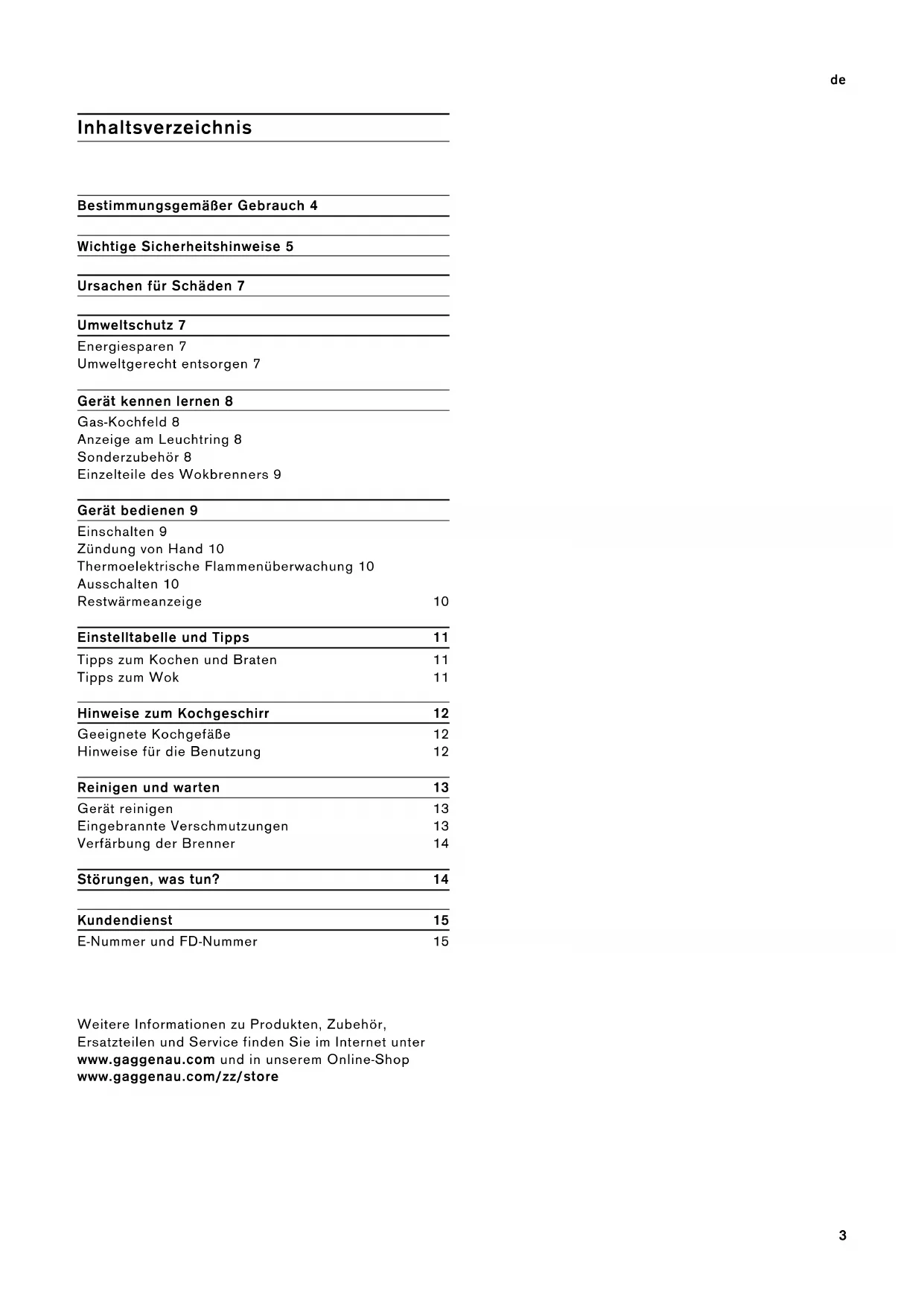 Inhaltsverzeichnis Gebrauchsanleitung Bestimmungsgemäßer Gebrauch 4 Wichtige Sicherheitshinweise 5 Ursachen für Schäden 7 Umweltschutz 7 Energiesparen 7 Umweltgerecht entsorgen 7 Gerät kennen lernen 8 Gas-Kochfeld 8 Anzeige am Leuchtring 8 Sonderzubehör 8 Einzelteile des Wokbrenners 9 Gerät bedienen 9 Einschalten 9 Zündung von Hand 10 Thermoelektrische Flammenüberwachung 10 Ausschalten 10 Restwärmeanzeige 10 Einstelltabelle und Tipps 11 Tipps zum Kochen und Braten 11 Tipps zum Wok 11 Hinweise zum Kochgeschirr 12 Geeignete Kochgefäße 12 Hinweise für die Benutzung 12 Reinigen und warten 13 Gerät reinigen 13 Eingebrannte Verschmutzungen 13 Verfärbung der Brenner 14 Störungen, was tun? 14 Kundendienst 15 E-Nummer und FD-Nummer 15 Weitere Informationen zu Produkten, Zubehör, Ersatzteilen und Service finden Sie im Internet unter www.gaggenau.com und in unserem Online-Shop www.gaggenau.com/zz/store4 de Bestimmungsgemäßer Gebrauch m Bestimmungsgemäßer Gebrauch Besti mmungsgemäßer Gebrauch Diese Anleitung sorgfältig lesen. Nur dann können Sie Ihr Gerät sicher und richtig bedienen. Die Gebrauchs- und Montageanleitung für einen späteren Gebrauch oder für Nachbesitzer aufbewahren. Dieses Gerät ist nur für den Einbau bestimmt. Spezielle Montageanleitung beachten. Der Einbau des Gerätes muss gemäß der beigefügten Montageanleitung erfolgen. Das Gerät nach dem Auspacken prüfen. Bei einem Transportschaden nicht anschließen. Nur ein konzessionierter Fachmann darf das Gerät anschließen. Bei Schäden durch falschen Anschluss besteht kein Anspruch auf Garantie. Für die Umstellung auf eine andere Gasart den Kundendienst rufen. Dieses Gerät ist nur für den privaten Haushalt und das häusliche Umfeld bestimmt. Das Gerät nur zum Zubereiten von Speisen und Getränken benutzen, niemals als Heizgerät verwenden. Das Gerät während des Betriebes beaufsichtigen. Das Gerät nur in einem Innenraum verwenden. Dieses Gerät nicht auf Booten oder in Fahrzeugen einbauen. Dieses Gerät ist für eine Nutzung bis zu einer Höhe von maximal 4000 Metern über dem Meeresspiegel bestimmt. Dieses Gerät ist nicht für den Betrieb mit einer externen Zeitschaltuhr oder einer Fernsteuerung bestimmt. Benutzen Sie keine Kochfeld-Abdeckungen. Sie können zu Unfällen führen, z.B. durch Überhitzung, Entzündung oder zerspringende Materialien. Benutzen Sie nur von uns freigegebene Schutzvorrichtungen oder Kinderschutzgitter. Ungeeignete Schutzvorrichtungen oder Kinderschutzgitter können zu Unfällen führen. Dieses Gerät kann von Kindern ab 8 Jahren und Personen mit reduzierten physischen, sensorischen oder mentalen Fähigkeiten oder Mangel an Erfahrung oder Wissen benutzt werden, wenn sie von einer Person, die für ihre Sicherheit verantwortlich ist, beaufsichtigt oder von ihr bezüglich des sicheren Gebrauchs des Gerätes unterwiesen wurden und sie die daraus resultierenden Gefahren verstanden haben. Kinder dürfen nicht mit dem Gerät spielen. Reinigung und Benutzer-Wartung dürfen nicht durch Kinder durchgeführt werden, es sei denn, sie sind 15 Jahre und älter und werden beaufsichtigt. Kinder jünger als 8 Jahre vom Gerät und der Anschlussleitung fernhalten. Sicherheitsventil an der Gaszufuhrleitung schließen, wenn das Gerät längere Zeit nicht in Betrieb ist.5 Wichtige Sicherheitshinweise
