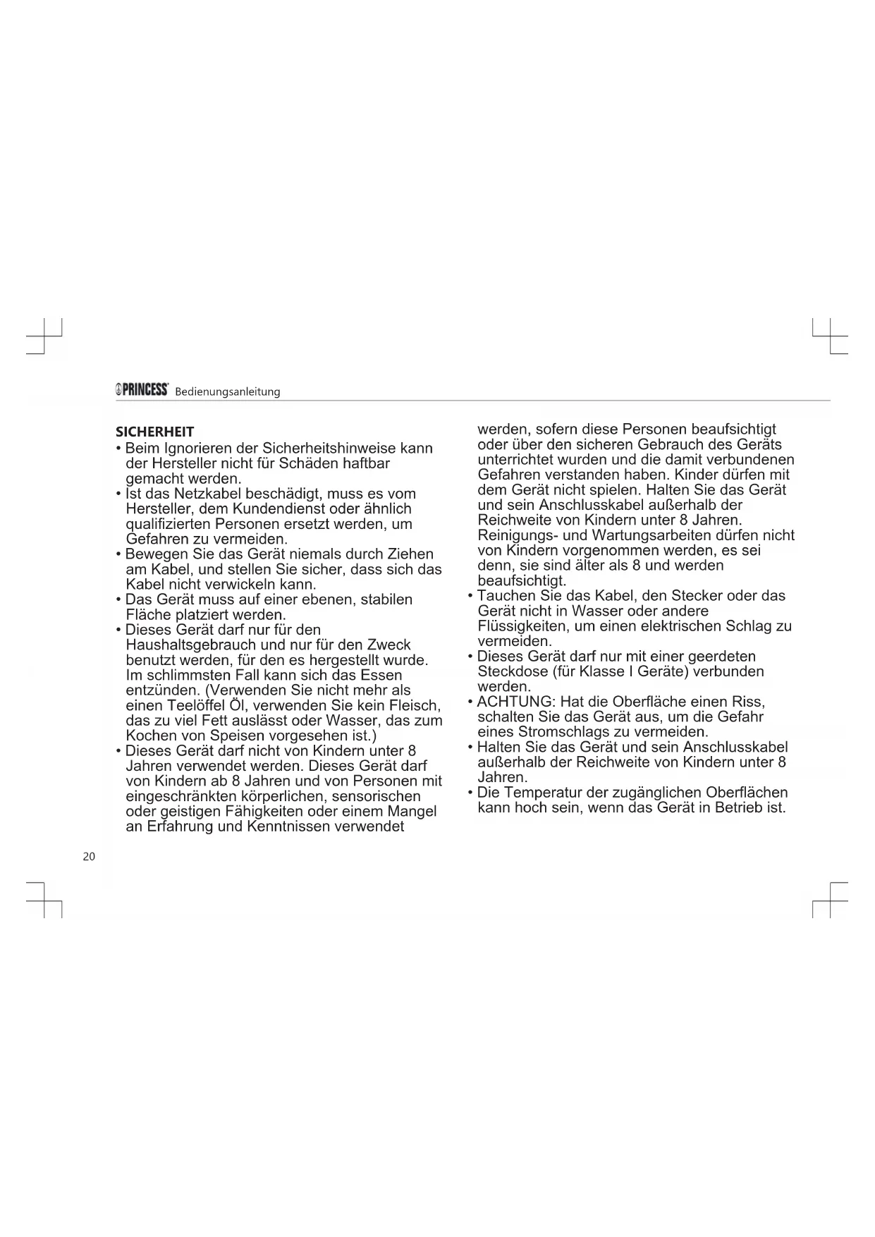 - Reinigen Sie das Gerät mit einem feuchten Tuch. Verwenden Sie niemals scharfe oder scheuernde Reiniger, Topfreiniger oder Stahlwolle. Dies würde das Gerät beschädigen. UMWELT Dieses Gerät darf am Ende seiner Lebenszeit nicht im Hausmüll entsorgt werden, sondern muss an einer Sammelstelle für das Recyceln von elektrischen und elektronischen Haushaltsgeräten abgegeben werden. Das Symbol auf dem Gerät, in der Bedienungsanleitung und auf der Verpackung macht Sie auf dieses wichtige Thema aufmerksam. Die in diesem Gerät verwendeten Materialien können recycelt werden. Durch das Recyceln gebrauchter Haushaltsgeräte leisten Sie einen wichtigen Beitrag zum Umweltschutz. Fragen Sie Ihre örtliche Behörde nach Informationen über eine Sammelstelle. Support Sie finden alle erhältlichen Informationen und Ersatzteile auf www.princesshome.eu! DEManual de instrucciones