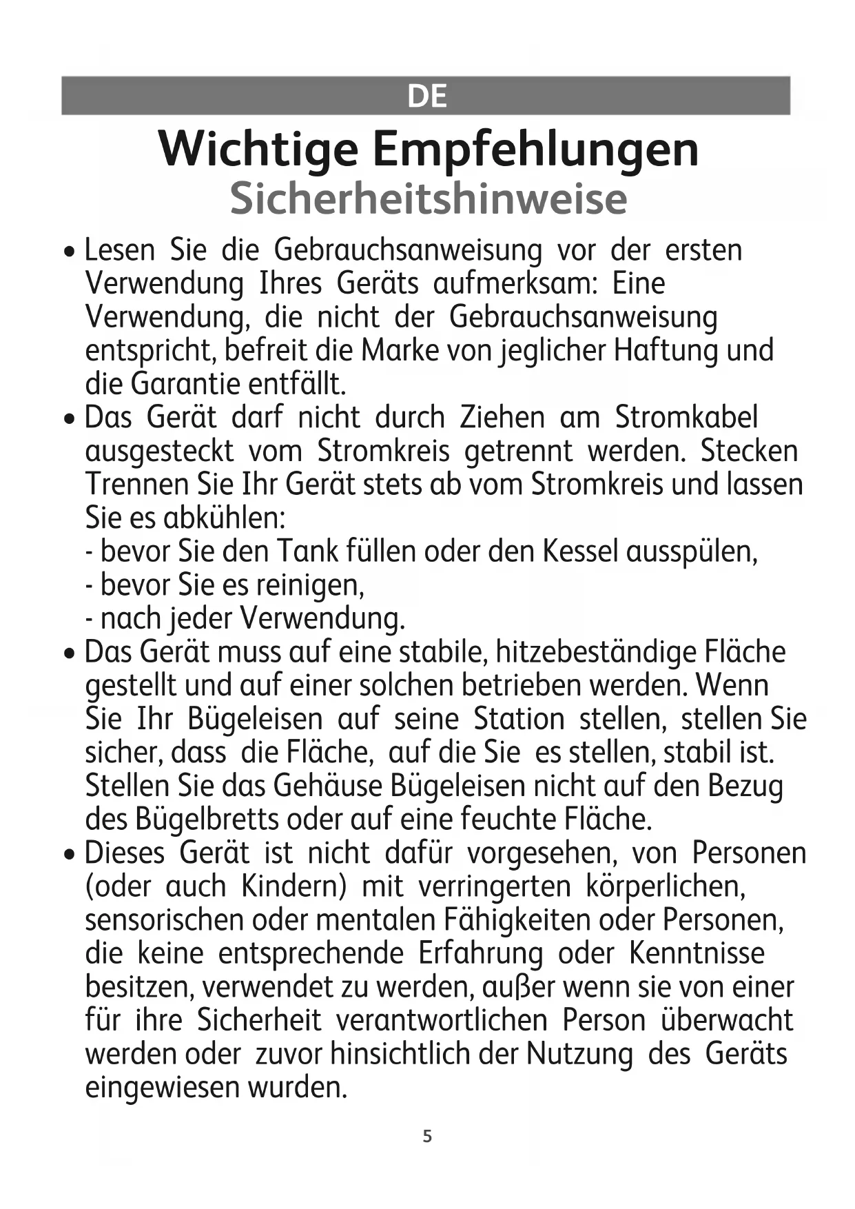 - Ihre Dampfstation ist ein elektrisches Gerät: Es muss unter normalen Gebrauchsbedingungen verwendet werden. Es ist nur für den Hausgebrauch bestimmt.