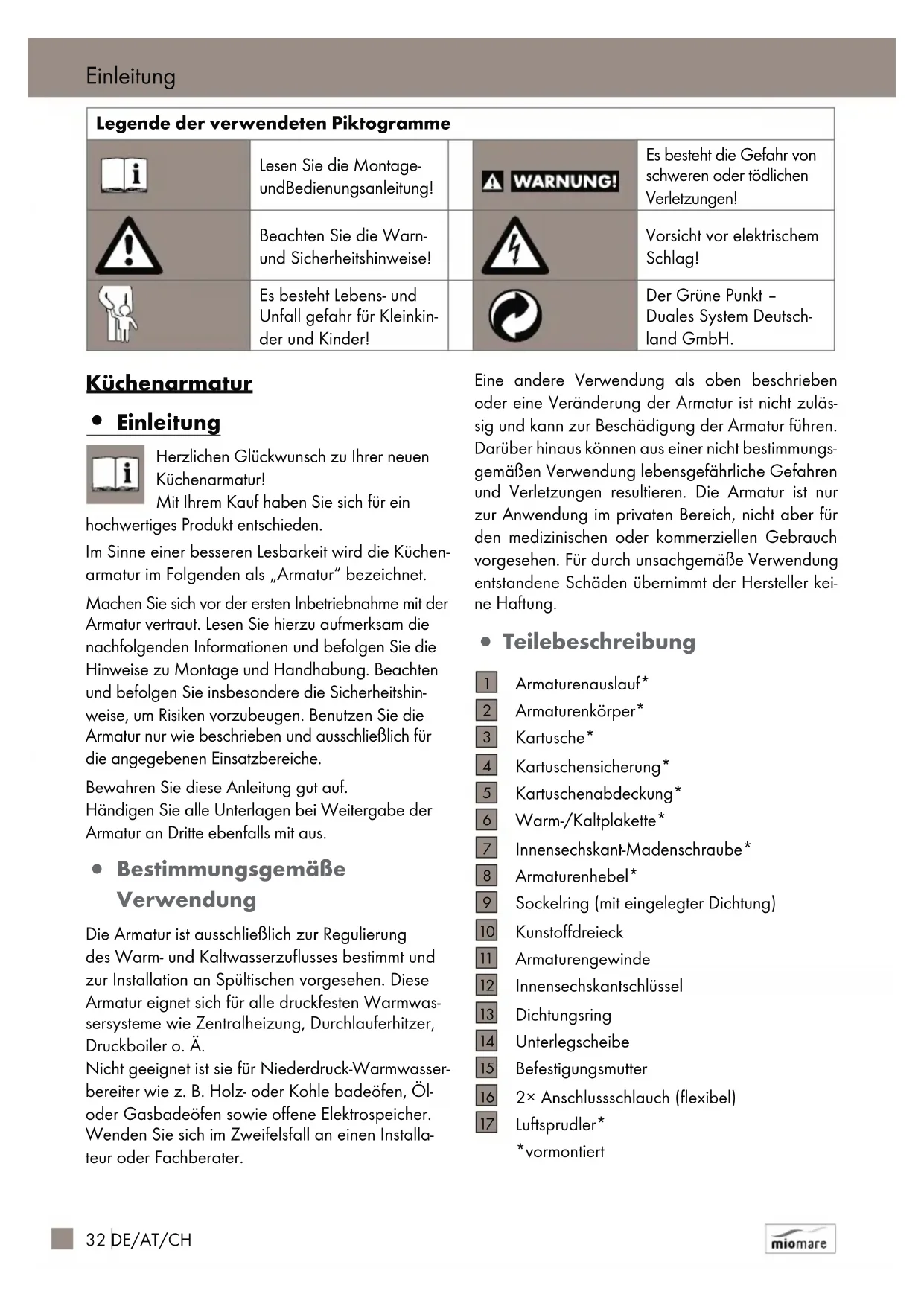 Luftsprudler* *vormontiert Legende der verwendeten Piktogramme Lesen Sie die Montage- und Bedienungsanleitung! Es besteht die Gefahr von schweren oder tödlichen Verletzungen! Beachten Sie die Warn- und Sicherheitshinweise! Vorsicht vor elektrischem Schlag! Es besteht Lebens- und Unfall gefahr für Kleinkin- der und Kinder! Der Grüne Punkt – Duales System Deutsch- land GmbH.33DE/AT/CH Einleitung