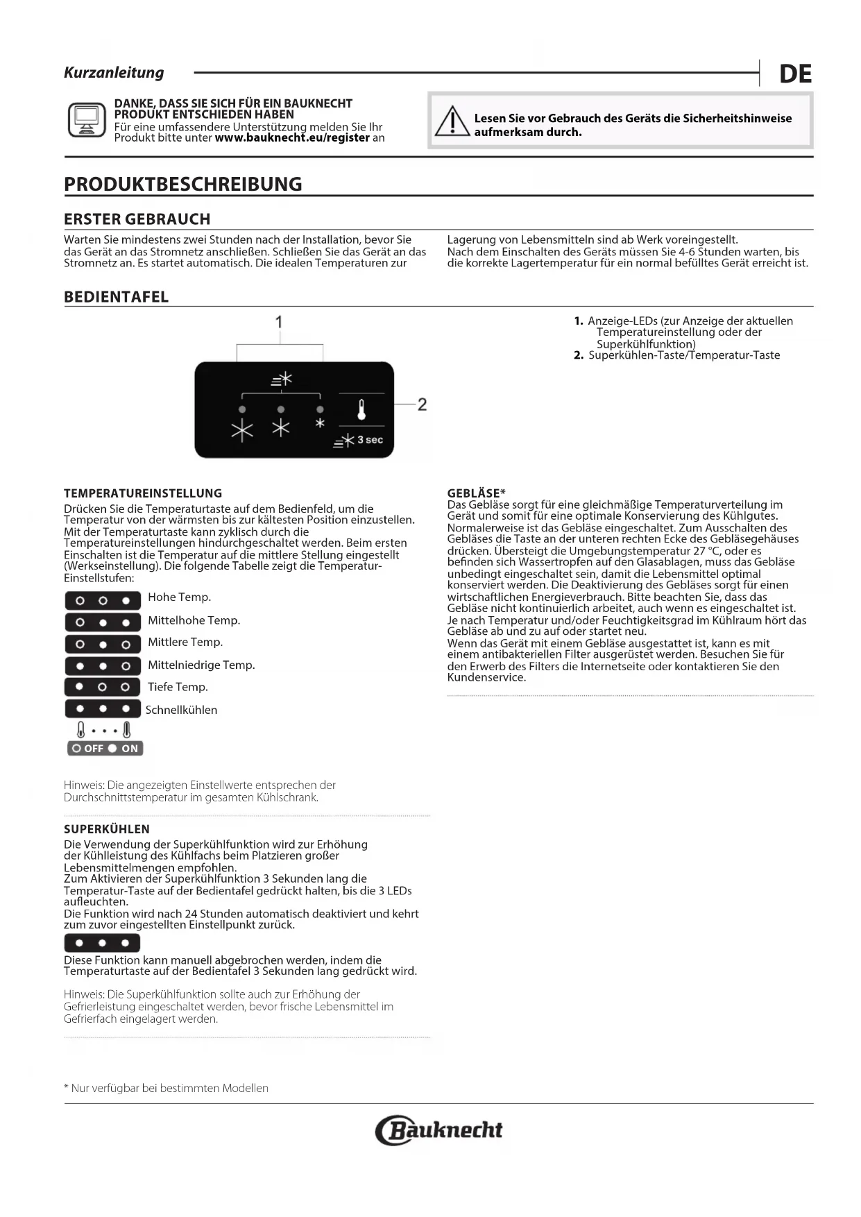 Für eine umfassendere Unterstützung melden Sie Ihr Produkt bitte unter www.bauknecht.eu/register an Lesen Sie vor Gebrauch des Geräts die Sicherheitshinweise aufmerksam durch. PRODUKTBESCHREIBUNG ERSTER GEBRAUCH Warten Sie mindestens zwei Stunden nach der Installation, bevor Sie das Gerät an das Stromnetz anschließen. Schließen Sie das Gerät an das Stromnetz an. Es startet automatisch. Die idealen Temperaturen zur Lagerung von Lebensmitteln sind ab Werk voreingestellt. Nach dem Einschalten des Geräts müssen Sie 4-6Stunden warten, bis die korrekte Lagertemperatur für ein normal befülltes Gerät erreicht ist. BEDIENTAFEL