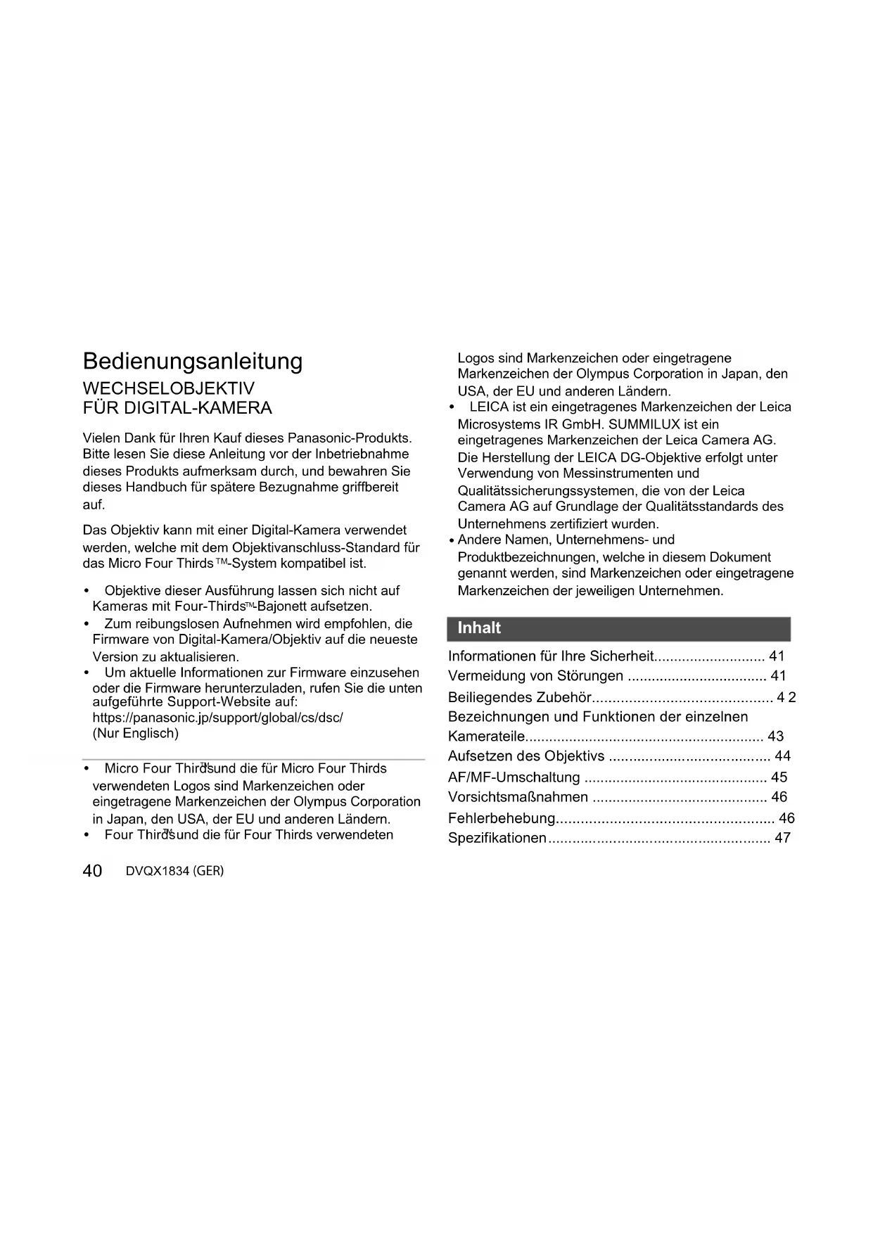 - und die für Four Thirds verwendeten Logos sind Markenzeichen oder eingetragene Markenzeichen der Olympus Corporation in Japan, den USA, der EU und anderen Ländern. 0 LEICA ist ein eingetragenes Markenzeichen der Leica Microsystems IR GmbH. SUMMILUX ist ein eingetragenes Markenzeichen der Leica Camera AG. Die Herstellung der LEICA DG-Objektive erfolgt unter Verwendung von Messinstrumenten und Qualitätssicherungssystemen, die von der Leica Camera AG auf Grundlage der Qualitätsstandards des Unternehmens zertifiziert wurden. Andere Namen, Unternehmens- und Produktbezeichnungen, welche in diesem Dokument genannt werden, sind Markenzeichen oder eingetragene Markenzeichen der jeweiligen Unternehmen. Informationen für Ihre Sicherheit p. 41