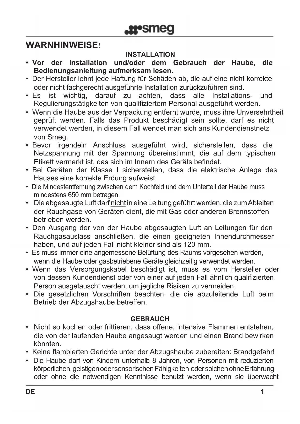 - Wenn die Haube aus der Verpackung entfernt wurde, muss ihre Unversehrtheit geprüft werden. Falls das Produkt beschädigt sein sollte, darf es nicht verwendet werden, in diesem Fall wendet man sich ans Kundendienstnetz von Smeg.