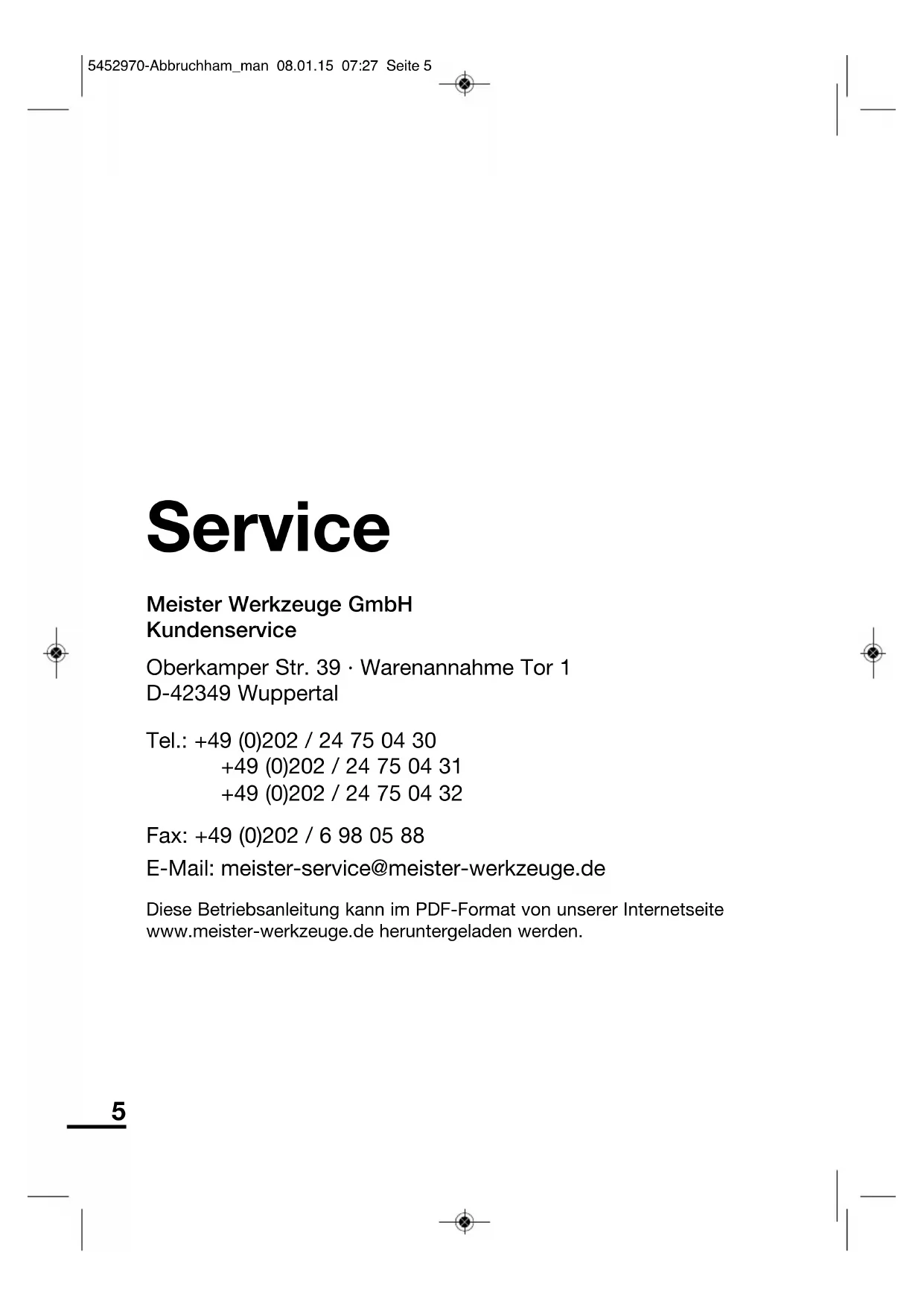 These Betriebsanleitung kann im PDF-Format von unserer Internetseite www.meister-werkzeuge.de heruntergeladen werden.