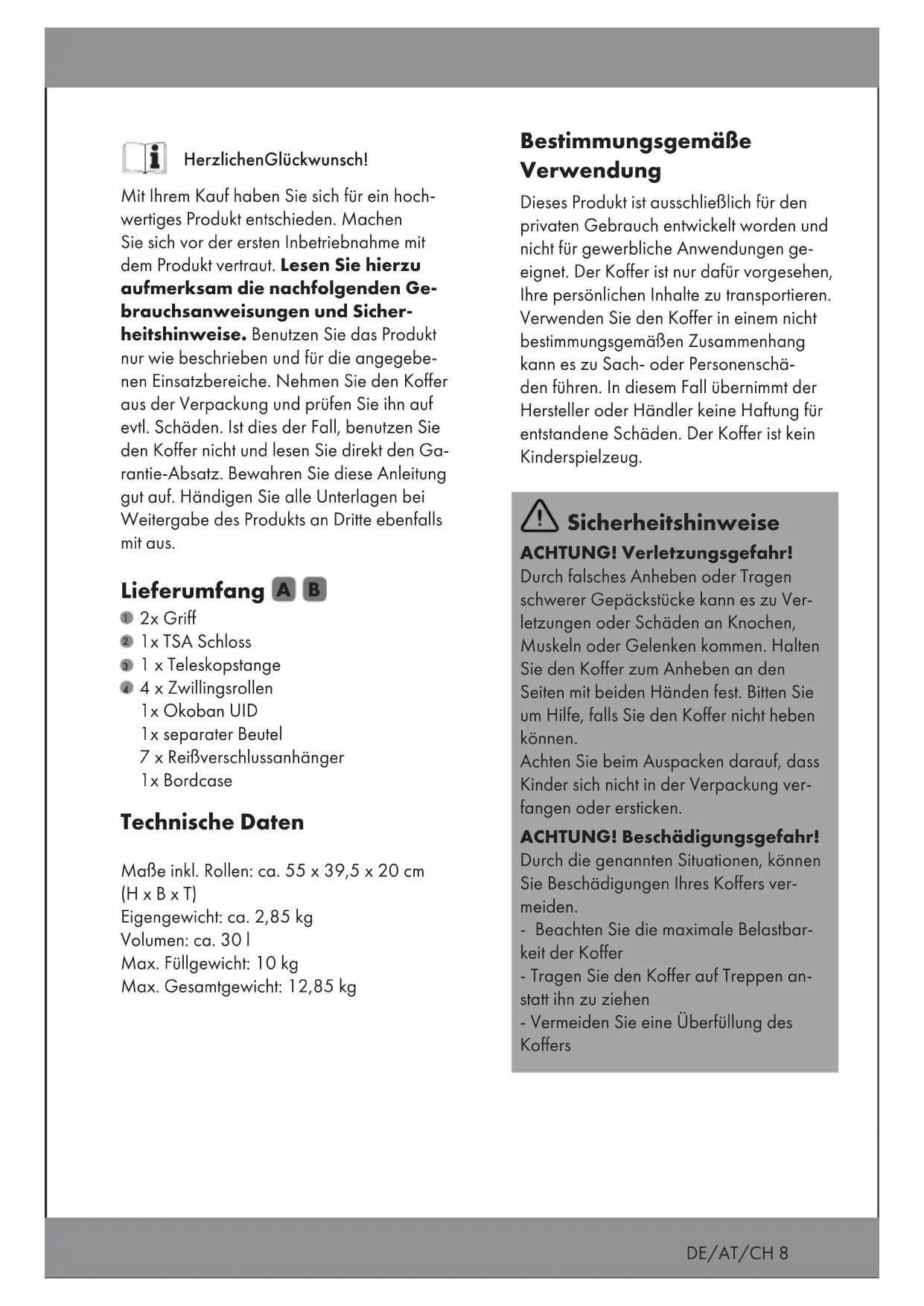 ÍndiceDE/AT/CH 8 Mit Ihrem Kauf haben Sie sich für ein hoch- wertiges Produkt entschieden. Machen Sie sich vor der ersten Inbetriebnahme mit dem Produkt vertraut. Lesen Sie hierzu aufmerksam die nachfolgenden Ge- brauchsanweisungen und Sicher- heitshinweise. Benutzen Sie das Produkt nur wie beschrieben und für die angegebe- nen Einsatzbereiche. Nehmen Sie den Koffer aus der Verpackung und prüfen Sie ihn auf evtl. Schäden. Ist dies der Fall, benutzen Sie den Koffer nicht und lesen Sie direkt den Ga- rantie-Absatz. Bewahren Sie diese Anleitung gut auf. Händigen Sie alle Unterlagen bei Weitergabe des Produkts an Dritte ebenfalls mit aus. Lieferumfang Technische Daten Maße inkl. Rollen: ca. 55 x 39,5 x 20 cm (H x B x T) Eigengewicht: ca. 2,85 kg Volumen: ca. 30 l Max. Füllgewicht: 10 kg Max. Gesamtgewicht: 12,85 kg Herzlichen Glückwunsch! Sicherheitshinweise ACHTUNG! Verletzungsgefahr! Durch falsches Anheben oder Tragen schwerer Gepäckstücke kann es zu Ver- letzungen oder Schäden an Knochen, Muskeln oder Gelenken kommen. Halten Sie den Koffer zum Anheben an den Seiten mit beiden Händen fest. Bitten Sie um Hilfe, falls Sie den Koffer nicht heben können. Achten Sie beim Auspacken darauf, dass Kinder sich nicht in der Verpackung ver- fangen oder ersticken. Bestimmungsgemäße Verwendung Dieses Produkt ist ausschließlich für den privaten Gebrauch entwickelt worden und nicht für gewerbliche Anwendungen ge- eignet. Der Koffer ist nur dafür vorgesehen, Ihre persönlichen Inhalte zu transportieren. Verwenden Sie den Koffer in einem nicht bestimmungsgemäßen Zusammenhang kann es zu Sach- oder Personenschä- den führen. In diesem Fall übernimmt der Hersteller oder Händler keine Haftung für entstandene Schäden. Der Koffer ist kein Kinderspielzeug. ACHTUNG! Beschädigungsgefahr! Durch die genannten Situationen, können Sie Beschädigungen Ihres Koffers ver- meiden. - Beachten Sie die maximale Belastbar- keit der Koffer - Tragen Sie den Koffer auf Treppen an- statt ihn zu ziehen - Vermeiden Sie eine Überfüllung des Koffers