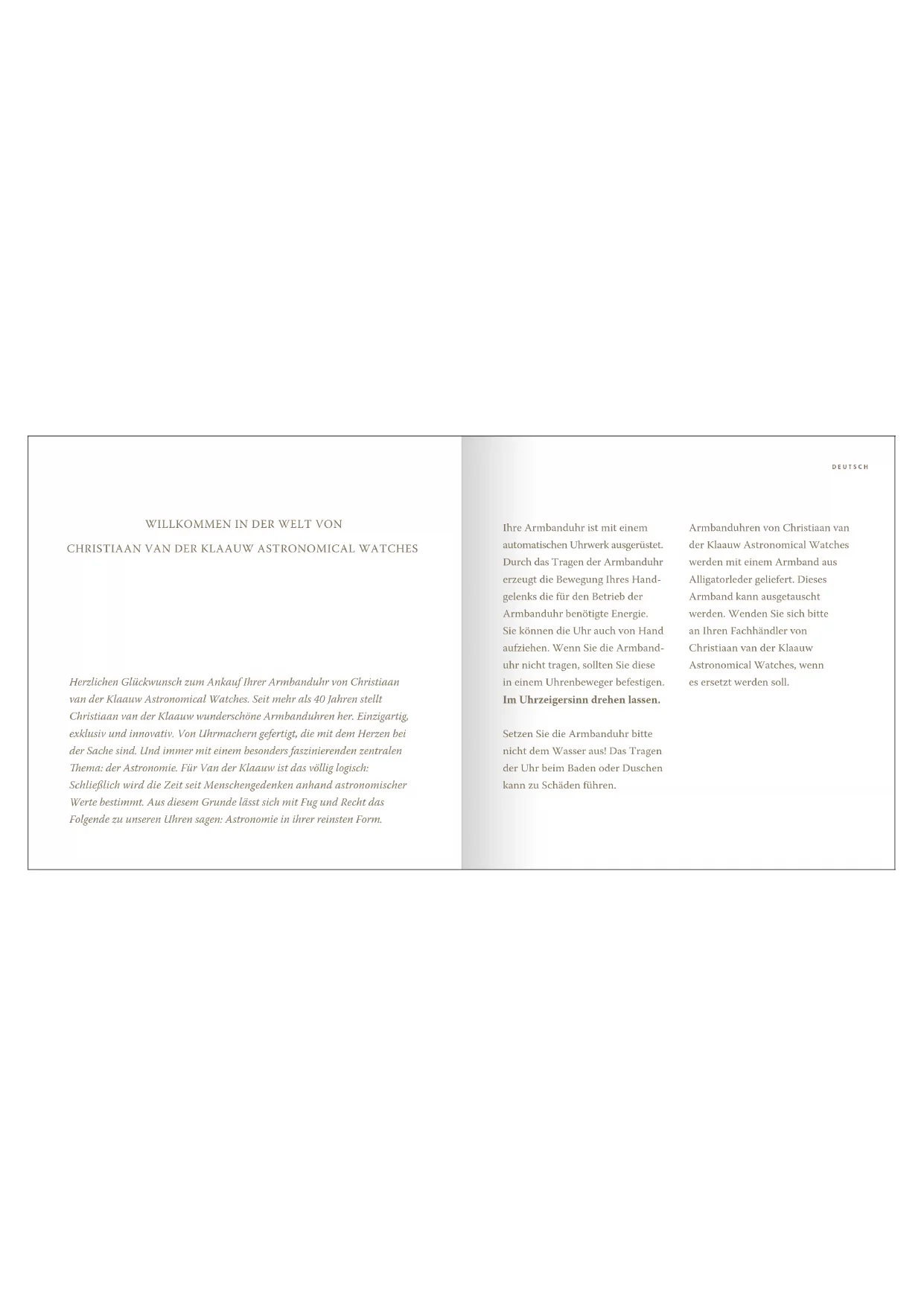 en dessous de la couronne, en position « 4 heures » sert à remettre le chronographe en position de départ. FRANÇAISFRANÇAISHerzlichen Glückwunsch zum Ankauf Ihrer Armbanduhr von Christiaan van der Klaauw Astronomical Watches. Seit mehr als 40 Jahren stellt Christiaan van der Klaauw wunderschöne Armbanduhren her. Einzigartig, exklusiv und innovativ. Von Uhrmachern gefertigt, die mit dem Herzen bei der Sache sind. Und immer mit einem besonders faszinierenden zentralen ema: der Astronomie. Für Van der Klaauw ist das völlig logisch: Schließlich wird die Zeit seit Menschengedenken anhand astronomischer Werte bestimmt. Aus diesem Grunde lässt sich mit Fug und Recht das Folgende zu unseren Uhren sagen: Astronomie in ihrer reinsten Form. Ihre Armbanduhr ist mit einem automatischen Uhrwerk ausgerüstet. Durch das Tragen der Armbanduhr erzeugt die Bewegung Ihres Hand- gelenks die für den Betrieb der Armbanduhr benötigte Energie. Sie können die Uhr auch von Hand aufziehen. Wenn Sie die Armband- uhr nicht tragen, sollten Sie diese in einem Uhrenbeweger befestigen. Im Uhrzeigersinn drehen lassen. Setzen Sie die Armbanduhr bitte nicht dem Wasser aus! Das Tragen der Uhr beim Baden oder Duschen kann zu Schäden führen. Armbanduhren von Christiaan van der Klaauw Astronomical Watches werden mit einem Armband aus Alligatorleder geliefert. Dieses Armband kann ausgetauscht werden. Wenden Sie sich bitte an Ihren Fachhändler von Christiaan van der Klaauw Astronomical Watches, wenn es ersetzt werden soll. DEUTSCH
