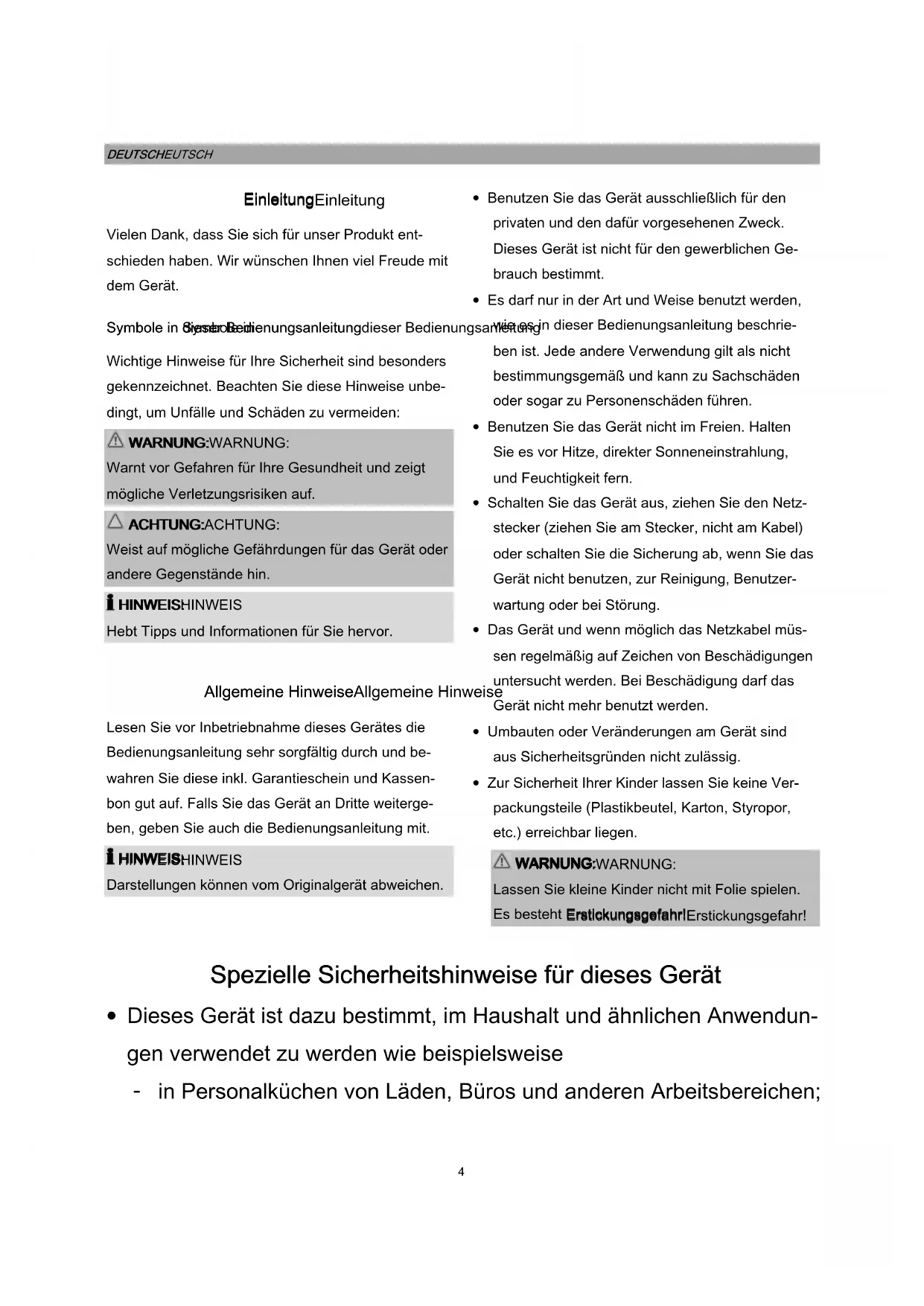 Lassen Sie kleine Kinder nicht mit Folie spielen. Es besteht Erstickungsgefahr! Erstickungsgefahr!Erstickungsgefahr! Erstickungsgefahr! Spezielle Sicherheitshinweise für dieses Gerät Spezielle Sicherheitshinweise für dieses GerätSpezielle Sicherheitshinweise für dieses Gerät Spezielle Sicherheitshinweise für dieses Gerät