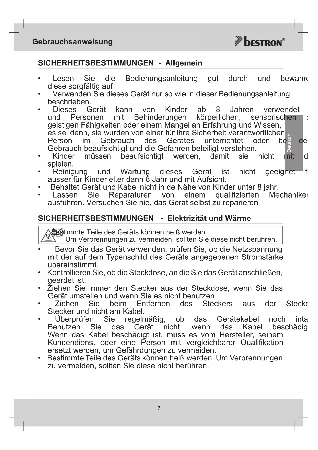 Sollte unerwartet eine Störung auftreten dann können Sie sich mit dem BESTRON-Kundendienst in Verbindungsetzen:www.bestron.com/service