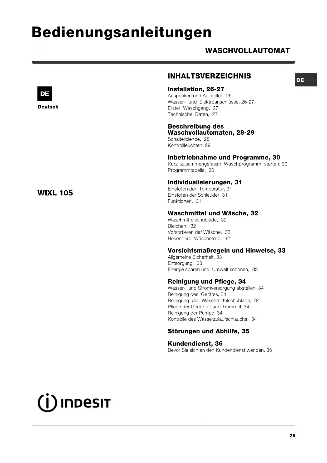 Vorsichtsmaßregeln und Hinweise KundendienstStörungenVorsichtsmaßregelnWartung und PflegeWaschprogramme WaschmittelInstallation Beschreibung Der Waschvollautomat wurde nach den strengsten internationalen Sicherheitsvorschriften entworfen und gebaut. Nachstehende Hinweise werden aus Sicherheits- gründen geliefert und sollten aufmerksam gelesen werden. Allgemeine Sicherheit Dieses Gerät wurde für den nicht professionellen Einsatz im privaten Haushalt konzipiert und seine Funktionen dürfen nicht verändert werden. Der Waschvollautomat darf nur von Erwachsenen und gemäß den Anleitungen dieses Handbuchs bedient werden. Berühren Sie das Gerät nicht, wenn Sie barfuß sind, und auch nicht mit nassen oder feuchten Händen oder Füßen. Ziehen Sie den Gerätestecker nicht am Kabel aus der Steckdose, sondern nur am Stecker selbst. Öffnen Sie die Waschmittelschublade nicht, wenn das Gerät in Betrieb ist. Berühren Sie nicht das Ablaufwasser, es kann sehr heiß sein. Öffnen Sie das Füllfenster nicht mit Gewalt: Der Sicherheits- Schließmechanismus könnte hierdurch beschädigt werden. Bei etwaigen Störungen versuchen Sie bitte nicht, Innenteile selbst zu reparieren. Halten Sie Kinder stets von dem in Betrieb befindlichen Gerät fern. Während des Waschgangs kann das Füllfenster sehr heiß werden. Muss der Waschvollautomat versetzt werden, sollten hierfür mindestens 2/3 Personen verfügbar sein. (Vorsichtig vorgehen). Versuchen Sie es niemals allein, das Gerät ist äußerst schwer. Vergewissern Sie sich, dass die Trommel völlig leer ist, bevor Sie die Wäsche einfüllen. Entsorgung Entsorgung des Verpackungsmaterials: Befolgen Sie die lokalen Vorschriften, Verpackungsma- terial kann wiederverwertet werden. Entsorgung von Elektroaltgeräten Gemäß der Europäischen Richtlinie 2002/96/EC über Elektro- und Elektronik-Altgeräte (WEEE) dürfen Elektrohaushalts-Altgeräte nicht über den herkömmlichen Haushaltsmüllkreislauf entsorgt werden. Altgeräte müssen separat gesammelt werden, um die Wiederverwertung und das Recycling der beinhalteten Materialien zu optimieren und die Einflüsse auf die Umwelt und die Gesundheit zu reduzieren. Das Symbol durchgestrichene Mülltonne auf jedem Produkt erinnert Sie an Ihre Verpflichtung, dass Elektrohaushaltsgeräte gesondert entsorgt werden müssen. Endverbraucher können sich an Abfallämter der Gemeinden wenden, um mehr Informationen über die korrekte Entsorgung ihrer Elektrohaushaltsgeräte zu erhalten. Entsorgung des Altgerätes: Machen Sie das Gerät vor der Entsorgung unbrauch- bar. Schneiden Sie das Kabel ab und nehmen Sie das Füllfenster ab. Energie sparen und Umwelt schonen Technologie im Dienste der Umwelt Glauben Sie, durch das Füllfenster hindurch wenig Wasser zu sehen? Dank der neuen Indesit-Technik genügt die halbe Wassermenge für eine maximale Sauberkeit: eine Maßnahme die zum Schutze der Umwelt angestrebt wurde. Waschmittel, Wasser, Energie und Zeit sparen Verschwendung von Strom, Wasser, Waschmittel und Zeit kann man vermeiden, indem man die Waschmaschine mit der empfohlenen Höchstwäschemenge benutzt. Bei einer vollen Auslastung Ihres Waschvollautomaten können Sie bis zu 50% Energie sparen. Vorwäsche ist nur bei stark verschmutzter Wäsche erforderlich. Durch Vermeidung einer solchen kann Waschmittel, Zeit, Wasser und 5-15% Energie gespart werden. Flecken sollten mit einem Fleckenmittel vorbehandelt werden, oder weichen Sie die Wäsche vor der Wäsche ein. Hierdurch können hohe Waschtemperaturen vermie- den werden. Ein 60°C-Programm anstelle eines 90°C- Programms, oder ein 40°C-Programm anstelle eines 60°C-Programms hilft bis zu 50% Energie zu sparen. Dosieren Sie Waschmittel sparsam je nach Wasserhärte, Verschmutzungsgrad und Wäschemenge, um die Umwelt nicht über Gebühr zu belasten: obwohl sie biologisch abbaubar sind, beinhalten Sie dennoch Stoffe, die die Umwelt belasten. Auch Weichmacher sollten höchst sparsam eingesetzt werden. Waschen Sie am späten Nachmittag oder in den ersten Morgenstunden, hierdurch tragen sie dazu bei, die Belastung der Elektrizitätswerke zu mindern. Die Option Delay Timer' (siehe Seite 31) hilft Ihnen in dieser Hinsicht außerordentlich. Soll die Wäsche in einem Wäschetrockner getrocknet werden, dann stellen Sie eine hohe Schleuder- geschwindigkeit ein. Je trockener die Wäsche geschleu- dert wird, desto niedriger ist der zum Trocknen erforderli- che Energieverbrauch.34