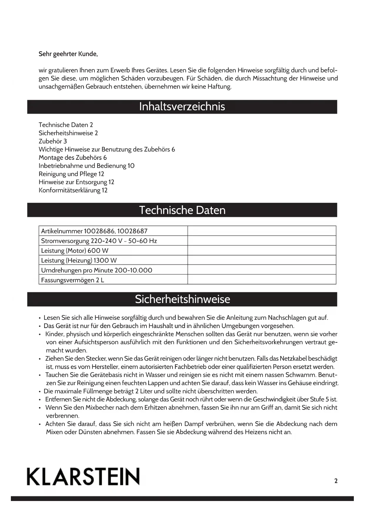 Küchenmaschine2 Sehr geehrter Kunde, wir gratulieren Ihnen zum Erwerb Ihres Gerätes. Lesen Sie die folgenden Hinweise sorgfältig durch und befol- gen Sie diese, um möglichen Schäden vorzubeugen. Für Schäden, die durch Missachtung der Hinweise und unsachgemäßen Gebrauch entstehen, übernehmen wir keine Haftung. Inhaltsverzeichnis Technische Daten 2 Sicherheitshinweise 2 Zubehör 3 Wichtige Hinweise zur Benutzung des Zubehörs 6 Montage des Zubehörs 6 Inbetriebnahme und Bedienung 10 Reinigung und Pflege 12 Hinweise zur Entsorgung 12 Konformitätserklärung 12 Technische Daten Artikelnummer 10028686, 10028687 Stromversorgung 220-240 V ~ 50-60 Hz Leistung (Motor) 600 W Leistung (Heizung) 1300 W Umdrehungen pro Minute 200-10.000 Fassungsvermögen 2 L Sicherheitshinweise