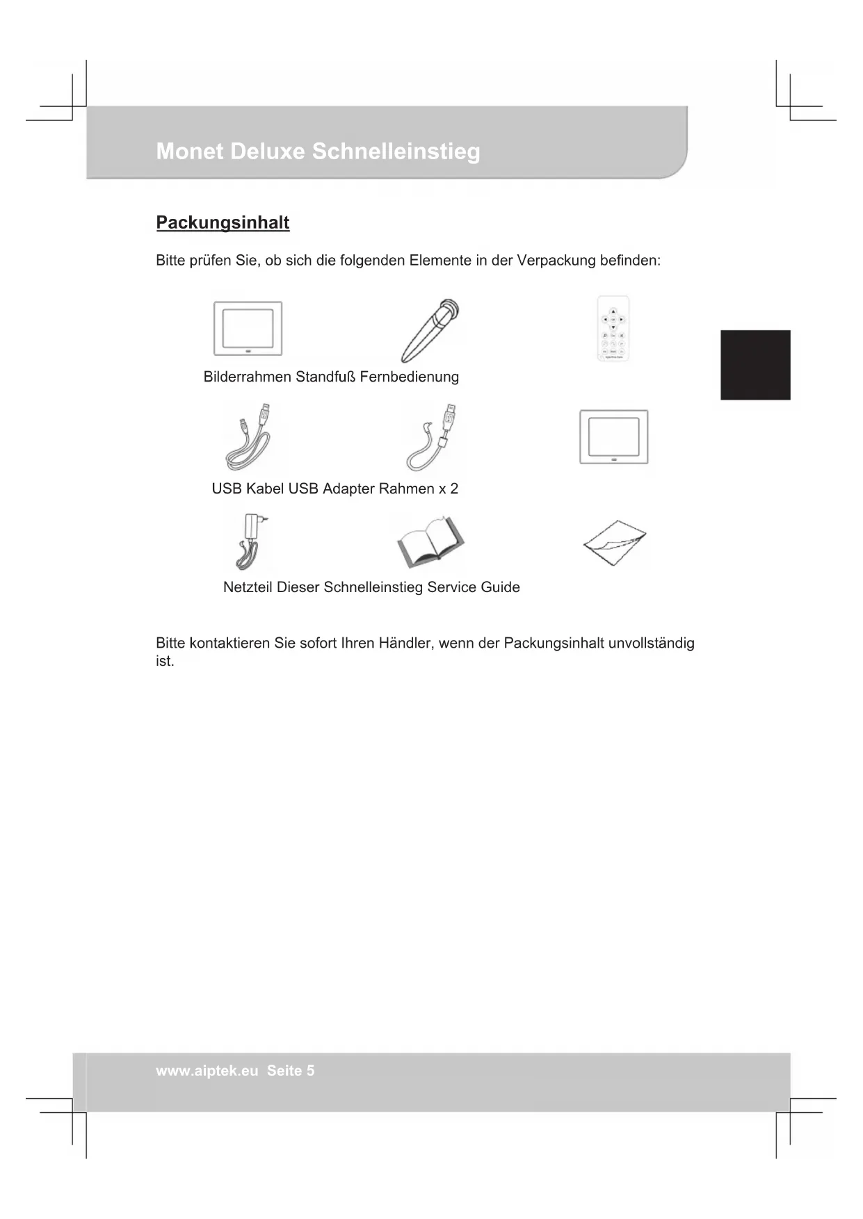 diese nicht in die Nähe des Gerätes. Wenn die Lebensdauer des Produkts zum Ende kommt, lassen Sie bitte möglichst alle Komponenten recyceln. Batterien und Akkus dürfen nicht mit Hausmüll zusammen entsorgt werden! Bitte entsorgen Sie diese bei einer lokalen Recyclingstelle. Zusammen leisten wir einen wertvollen Beitrag zum Schutz unserer Umwelt.Monet Deluxe Schnelleinstieg ENDEFRITTU www.aiptek.eu Seite 4 Monet Deluxe Schnelleinstieg Inhaltsverzeichnis Sicherheitshinweise ................................................................................. Seite 3 Packungsinhalt ........................................................................................ Seite 5 Der Bilderrahmen im Überblick................................................................ Seite 6 Standfuß installieren ................................................................................ Seite 7 Inbetriebnahme........................................................................................ Seite 7 Speicherkarte einlegen ............................................................................ Seite 7 Funktionsübersicht .................................................................................. Seite 8 Foto ......................................................................................................... Seite 11 Musik ....................................................................................................... Seite 13 Video ....................................................................................................... Seite 14 Unterstützte Videoformate ....................................................................... Seite 15 Dateimanager .......................................................................................... Seite 16 Einstellungen ........................................................................................... Seite 17 PC Verbindung ........................................................................................ Seite 18 Specikationen ........................................................................................ Seite 19 Garantie ................................................................................................... Seite 20 Technische Bezeichungen ....................................................................... Seite 20Monet Deluxe Schnelleinstieg ENDEFRITTU www.aiptek.eu Seite 5 Packungsinhalt Bitte prüfen Sie, ob sich die folgenden Elemente in der Verpackung benden: Bilderrahmen Standfuß Fernbedienung USB Kabel USB Adapter Rahmen x 2 Netzteil Dieser Schnelleinstieg Service Guide Bitte kontaktieren Sie sofort Ihren Händler, wenn der Packungsinhalt unvollständig ist.Monet Deluxe Schnelleinstieg ENDEFRITTU www.aiptek.eu Seite 6 Monet Deluxe Schnelleinstieg Der Bilderrahmen im Überblick Monet Deluxe bietet verschiedene Anschlüsse und Knöpfe zur Bedienung: