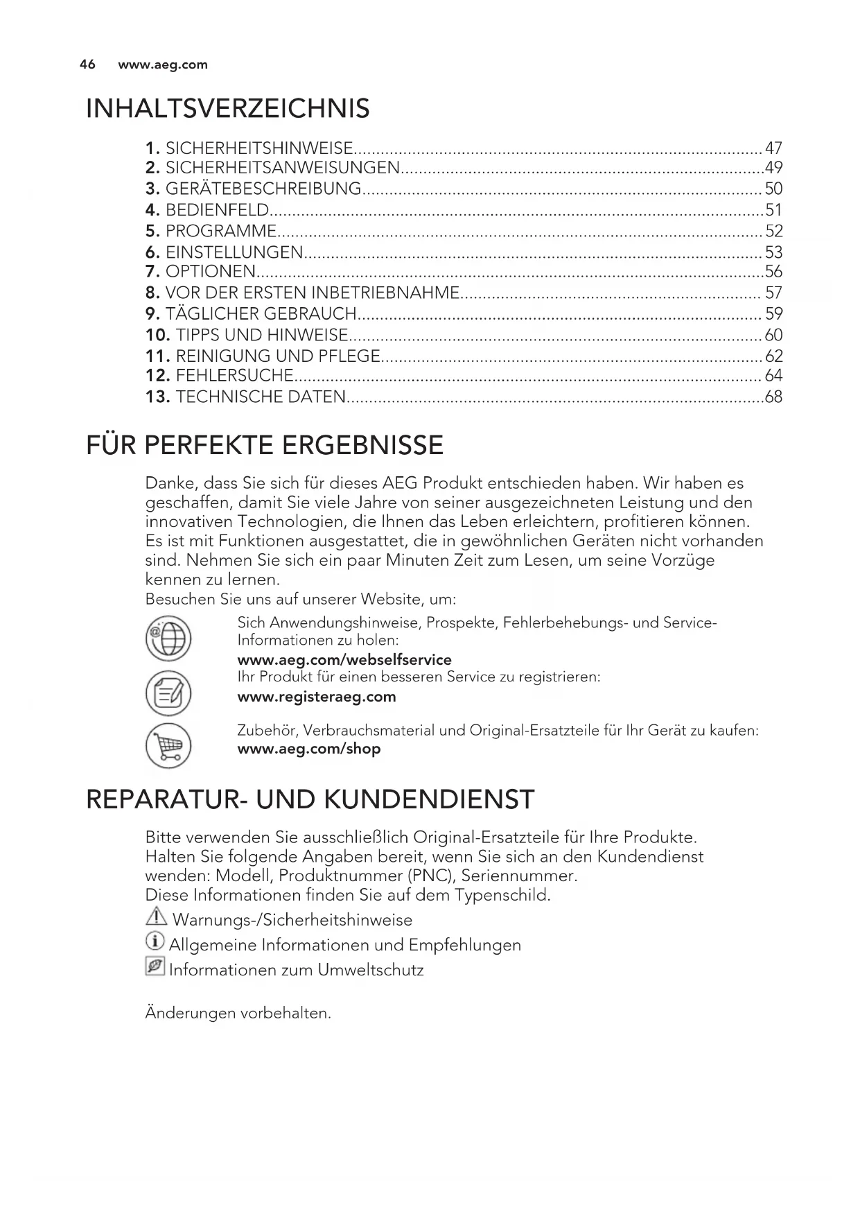 Bitte verwenden Sie ausschließlich Original-Ersatzteile für Ihre Produkte. Halten Sie folgende Angaben bereit, wenn Sie sich an den Kundendienst wenden: Modell, Produktnummer (PNC), Seriennummer. Diese Informationen finden Sie auf dem Typenschild. Warnungs-/Sicherheitshinweise Allgemeine Informationen und Empfehlungen Informationen zum Umweltschutz Änderungen vorbehalten. www.aeg.com