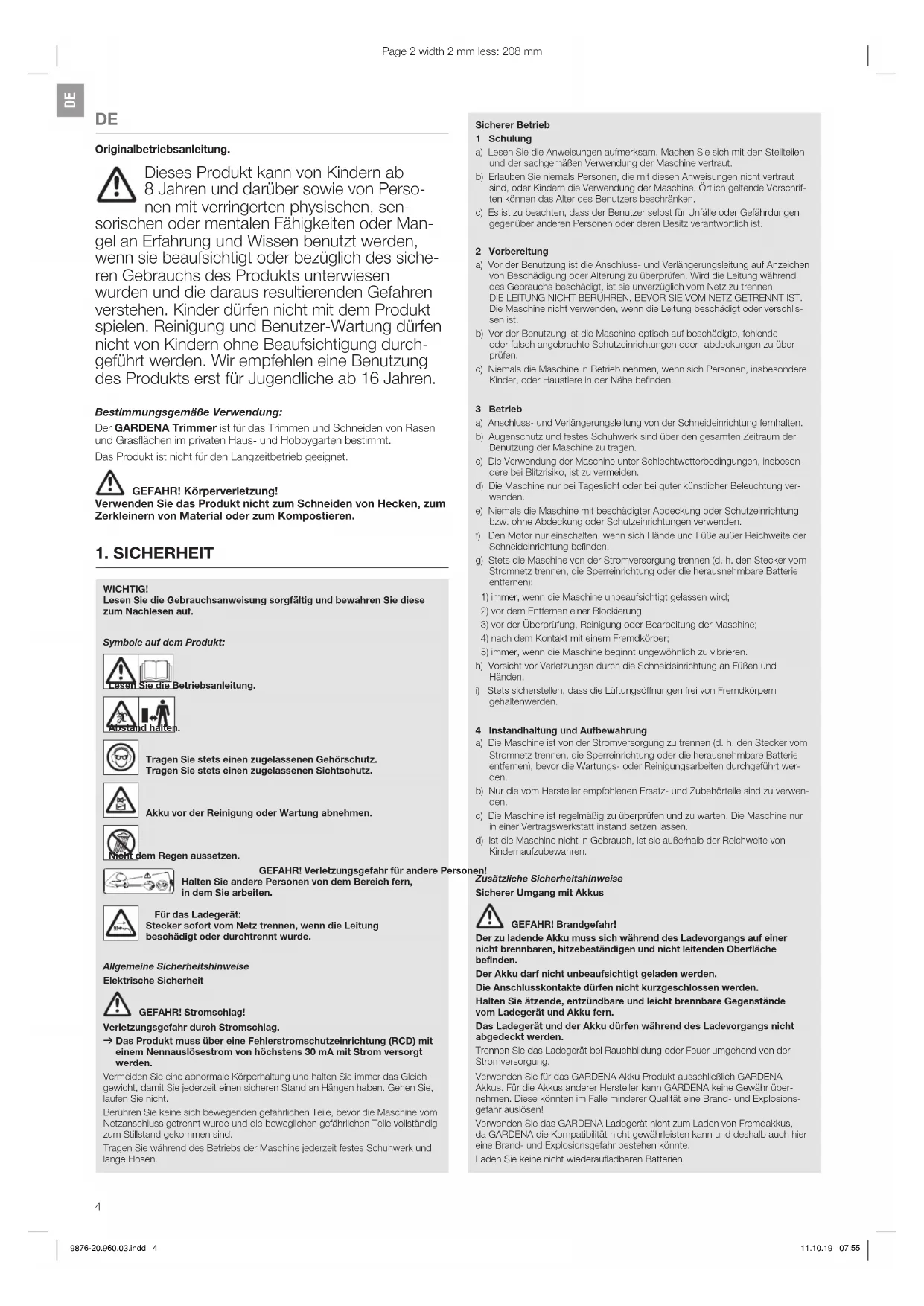 9876-20.960.03.indd 3 11.10.19 07:55DE Originalbetriebsanleitung. Dieses Produkt kann von Kindern ab 8Jahren und darüber sowie von Perso- nenmit verringerten physischen, sen- sorischen oder mentalen Fähigkeiten oder Man- gelan Erfahrung und Wissen benutzt werden, wenn sie beaufsichtigt oder bezüglich des siche- ren Gebrauchs des Produkts unterwiesen wurden und die daraus resultierenden Gefahren verstehen. Kinder dürfen nicht mit dem Produkt spielen. Reinigung und Benutzer-Wartung dürfen nicht von Kindern ohne Beaufsichtigung durch- geführt werden. Wir empfehlen eine Benutzung des Produkts erst für Jugendliche ab 16 Jahren. Bestimmungsgemäße Verwendung: Der GARDENA Trimmer ist für das Trimmen und Schneiden von Rasen und Grasflächen im privaten Haus- und Hobbygarten bestimmt. Das Produkt ist nicht für den Langzeitbetrieb geeignet.
