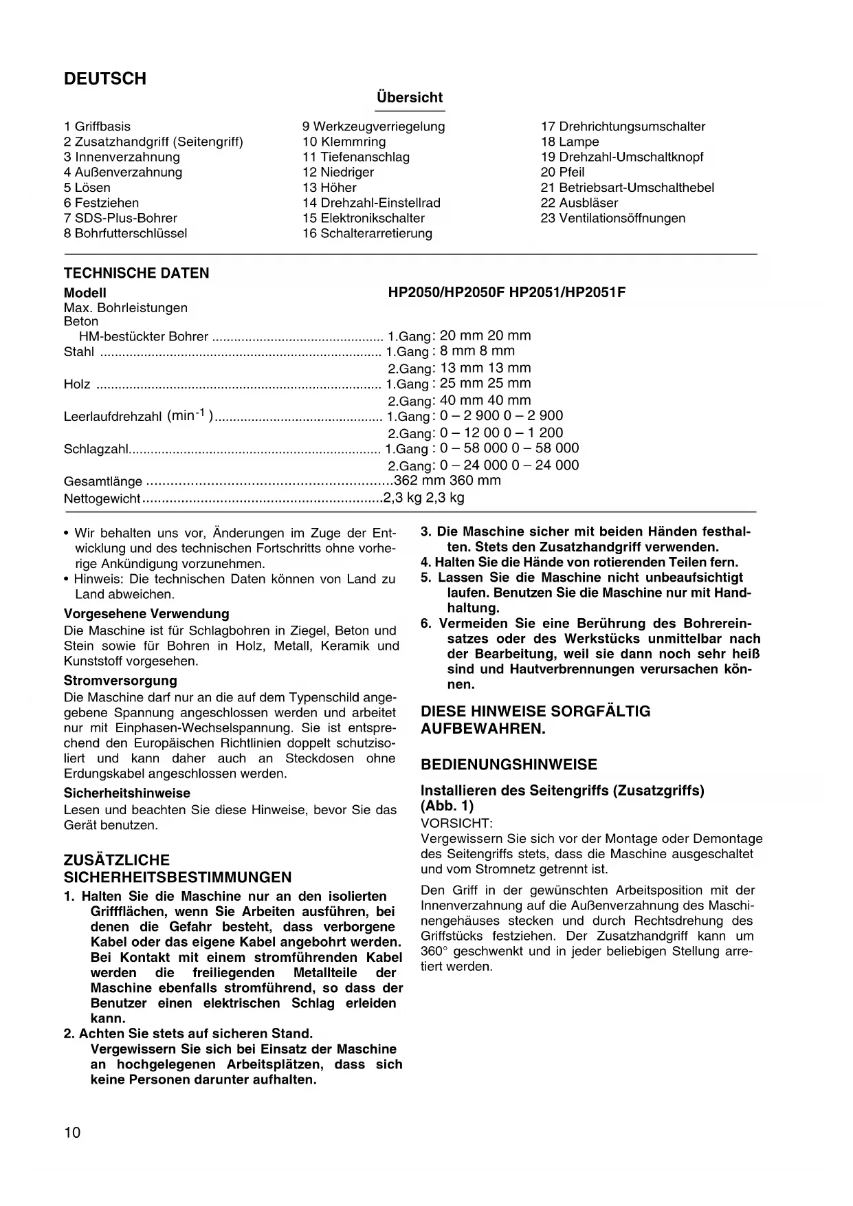 AUFBEWAHREN. BEDIENUNGSHINWEISE Installieren des Seitengriffs (Zusatzgriffs) (Abb. 1) VORSICHT: Vergewissern Sie sich vor der Montage oder Demontage des Seitengriffs stets, dass die Maschine ausgeschaltet und vom Stromnetz getrennt ist. Den Griff in der gewünschten Arbeitsposition mit der Innenverzahnung auf die Außenverzahnung des Maschi- nengehäuses stecken und durch Rechtsdrehung des Griffstücks festziehen. Der Zusatzhandgriff kann um 360° geschwenkt und in jeder beliebigen Stellung arre- tiert werden.11 Montage und Demontage von Einsatzwerkzeugen (Abb. 2 u. 3) VORSICHT: Vergewissern Sie sich vor der Montage bzw. Demontage eines Einsatzwerkzeuges grundsätzlich, daß die Maschine abgeschaltet und der Netzstecker gezogen ist. Für HP2050 und HP2050F Das Einsatzwerkzeug so weit wie möglich in das Bohrfut- ter einsetzen. Das Bohrfutter von Hand festziehen. Den Bohrfutterschlüssel in jede der drei Bohrfutter-Bohrun- gen einsetzen und im Uhrzeigersinn festziehen. An allen drei Bohrfutter-Bohrungen gleichmäßig spannen. Zum Entfernen eines Einsatzwerkzeuges den Bohrfutter- schlüssel in einer Bohrfutter-Bohrung gegen den Uhrzei- gersinn drehen. Danach kann das Bohrfutter von Hand gelöst werden. Den Bohrfutterschlüssel nach Verwen- dung wieder in die dafür vorgesehene Halterung an der Schlagbohrmaschine einsetzen. Für HP2051und HP2051F Halten Sie den Klemmring fest und drehen Sie die Werk- zeugverriegelung entgegen dem Uhrzeigersinn, um die Bohrfutterbacken zu öffnen. Führen Sie das Einsatzwerk- zeug bis zum Anschlag in das Spannfutter ein. Halten Sie den Klemmring fest und drehen Sie die Werkzeug- verriegelung im Uhrzeigersinn, um das Bohrfutter festzu- ziehen. Zum Entfernen des Einsatzwerkzeugs halten Sie den Klemmring und drehen die Werkzeugverriegelung entgegen dem Uhrzeigersinn. Bohrtiefenbegrenzung (Abb. 4) Die Bohrtiefe kann über den Tiefenanschlag eingestellt werden. Dazu lösen Sie den Zusatzhandgriff und führen den Tiefenanschlag in die Bohrung am Griff ein. Stellen Sie den Tiefenanschlag auf die gewünschte Bohrtiefe und ziehen anschließend den Zusatzhandgriff wieder fest. HINWEIS: Bei Positionierung des Tiefenanschlags gegen das Getriebegehäuse kann dieser nicht verwendet werden. Schalterfunktion (Abb. 5) VORSICHT: Vor dem Anschließen der Maschine an das Stromnetz stets überprüfen, ob der Elektronikschalter ordnungsge- mäß funktioniert und beim Loslassen in die AUS- Stel- lung zurückkehrt. Die Drehzahl erhöht sich durch verstärkte Druckaus- übung auf den Elektronikschalter. Zum Einschalten drük- ken Sie den Elektronikschalter. Zum Ausschalten lassen Sie den Schalter los. Für Dauerbetrieb drücken Sie den Elektronikschalter und gleichzeitig die Schalterarretie- rung. Zum Ausschalten des Dauerbetriebs den Elektro- nikschalter drücken und wieder loslassen. Die Maschine ist mit einem Drehzahl-Einstellrad zur Begrenzung der maximalen Maschinengeschwindigkeit (variabel) ausgestattet. Drehen Sie das Drehzahl-Ein- stellrad zum Erhöhen der Drehzahl nach rechts und zum Verringern der Drehzahl nach links. Einschalten der Lampen (HP2050F und HP2051F) VORSICHT: Blicken Sie nicht direkt in das Licht oder die Lichtquelle. Betätigen Sie den Ein-Aus-Schalter zum Einschalten der Lampe. Lassen Sie den Ein-Aus-Schalter zum Ausschal- ten der Lampe los. HINWEIS: Wischen Sie Schmutz auf der Linse der Lampe mit einem trockenen Tuch ab. Achten Sie sorgfältig darauf, dass Sie die Linse der Lampe nicht verkratzen, weil sich sonst die Lichtstärke verringert. Drehrichtungsumschalter (Abb. 6) Diese Maschine besitzt einen Drehrichtungsumschalter. Stellen Sie den Drehrichtungs-Umschalthebel für Rechtsdrehung auf die Stellung D (Seite A) oder für Linksdrehung auf die Stellung