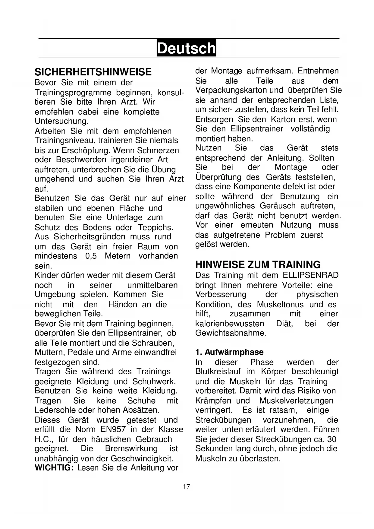 Deutsch SICHERHEITSHINWEISE Bevor Sie mit einem der Trainingsprogramme beginnen, konsul- tieren Sie bitte Ihren Arzt. Wir empfehlen dabei eine komplette Untersuchung. Arbeiten Sie mit dem empfohlenen Trainingsniveau, trainieren Sie niemals bis zur Erschöpfung. Wenn Schmerzen oder Beschwerden irgendeiner Art auftreten, unterbrechen Sie die Übung umgehend und suchen Sie Ihren Arzt auf. Benutzen Sie das Gerät nur auf einer stabilen und ebenen Fläche und benuten Sie eine Unterlage zum Schutz des Bodens oder Teppichs. Aus Sicherheitsgründen muss rund um das Gerät ein freier Raum von mindestens 0,5 Metern vorhanden sein. Kinder dürfen weder mit diesem Gerät noch in seiner unmittelbaren Umgebung spielen. Kommen Sie nicht mit den Händen an die beweglichen Teile. Bevor Sie mit dem Training beginnen, überprüfen Sie den Ellipsentrainer, ob alle Teile montiert und die Schrauben, Muttern, Pedale und Arme einwandfrei festgezogen sind. Tragen Sie während des Trainings geeignete Kleidung und Schuhwerk. Benutzen Sie keine weite Kleidung. Tragen Sie keine Schuhe mit Ledersohle oder hohen Absätzen. Dieses Gerät wurde getestet und erfüllt die Norm EN957 in der Klasse H.C., für den häuslichen Gebrauch geeignet. Die Bremswirkung ist unabhängig von der Geschwindigkeit. WICHTIG: Lesen Sie die Anleitung vor der Montage aufmerksam. Entnehmen Sie alle Teile aus dem Verpackungskarton und überprüfen Sie sie anhand der entsprechenden Liste, um sicher- zustellen, dass kein Teil fehlt. Entsorgen Sie den Karton erst, wenn Sie den Ellipsentrainer vollständig montiert haben. Nutzen Sie das Gerät stets entsprechend der Anleitung. Sollten Sie bei der Montage oder Überprüfung des Geräts feststellen, dass eine Komponente defekt ist oder sollte während der Benutzung ein ungewöhnliches Geräusch auftreten, darf das Gerät nicht benutzt werden. Vor einer erneuten Nutzung muss das aufgetretene Problem zuerst gelöst werden.