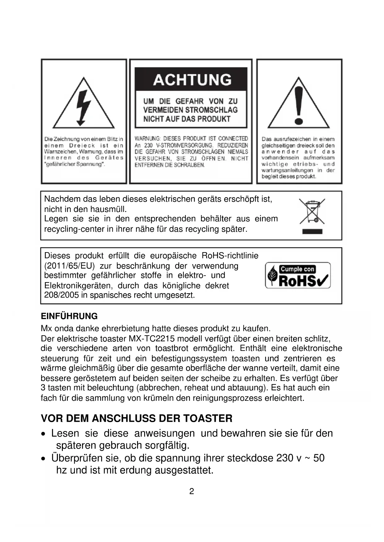 - Überprüfen sie, ob die spannung ihrer steckdose 230 v ~ 50 hz und ist mit erdung ausgestattet. Nachdem das leben dieses elektrischen geräts erschöpft ist, nicht in den hausmüll. Legen sie sie in den entsprechenden behälter aus einem recycling-center in ihrer nähe für das recycling später. Dieses produkt erfüllt die europäische RoHS-richtlinie (2011/65/EU) zur beschränkung der verwendung bestimmter gefährlicher stoffe in elektro- und Elektronikgeräten, durch das königliche dekret 208/2005 in spanisches recht umgesetzt.3