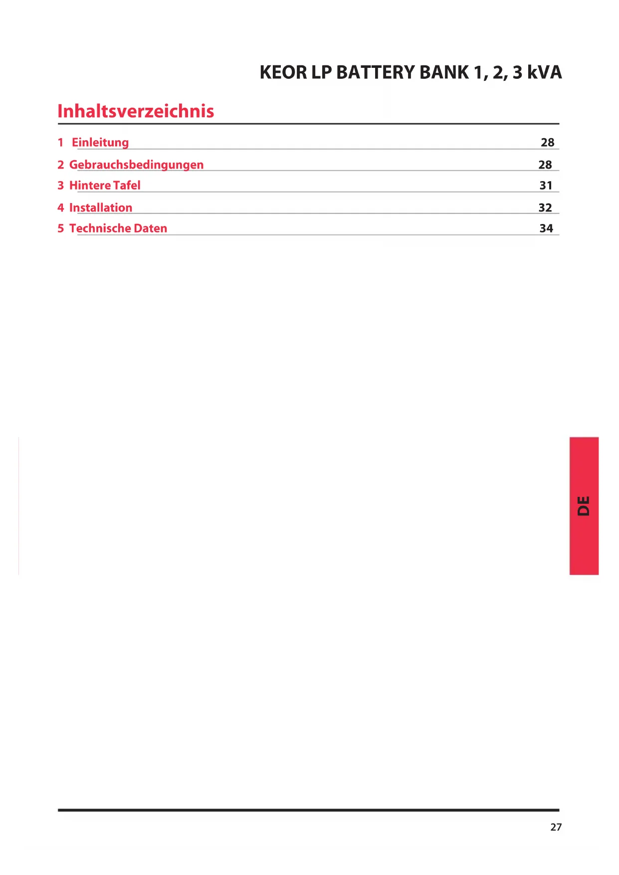 Inhaltsverzeichnis 1 Einleitung 28 2 Gebrauchsbedingungen 28 3 Hintere Tafel 31 4 Installation 32 5 Technische Daten 3428