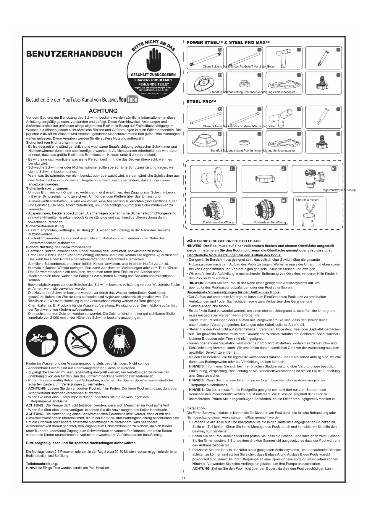 E F G HA B C D STEEL PRO™ E F G HA B C DObere Schiene Senkrechtes Poolbein T-Verbinder BolzenStandfuß Bolzendichtung Pool-Innenverkleidung SchlauchadapterObere Schiene Senkrechtes Poolbein T-Verbinder BolzenStandfuß Bolzendichtung Pool-Innenverkleidung Schlauchadapter BENUTZERHANDBUCH Besuchen Sie den YouTube-Kanal von Bestway FRAGEN? PROBLEME?FEHLENDE TEILE?Wegen FAQs, Bedienungsanleitungen, Videos oder Ersatzteilen besuchen Sie bitte www.bestwaycorp.com